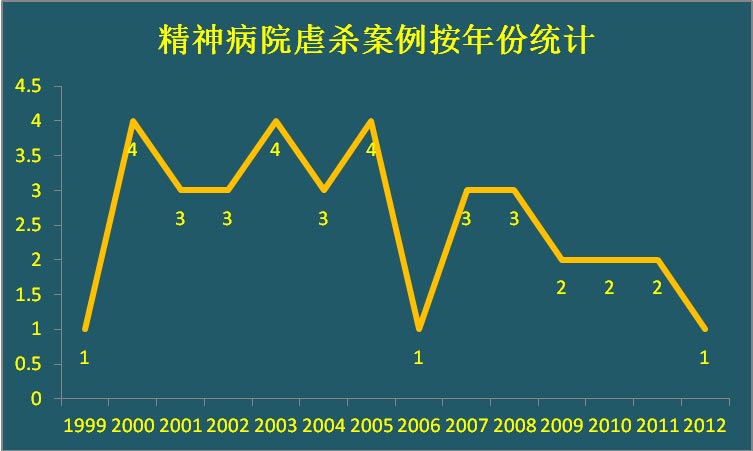 從被虐殺時間來看,從一九九九年到二零一二年這十三年間,精神病院虐殺法輪功學員案例時有發生,其中二零零零年到二零零五年是精神病院虐殺法輪功學員的高峰: