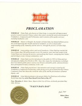 鑑於,法輪大法從一九九二年在中國傳出。一九九六年法輪大法弘傳到達拉斯-福特沃斯地區。從那以後,在達福地區許多圖書館、公園舉辦了許多期免費法輪大法教功班。法輪大法修煉者參加了許許多多社區活動;