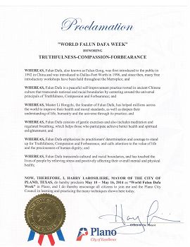 鑑於,在美國以及全世界各地的法輪大法學員將滿懷喜悅以各種形式的活動來慶祝二零一四五月十三日世界法輪大法日,包括在布蘭諾Russell Creek公園舉辦的活動;