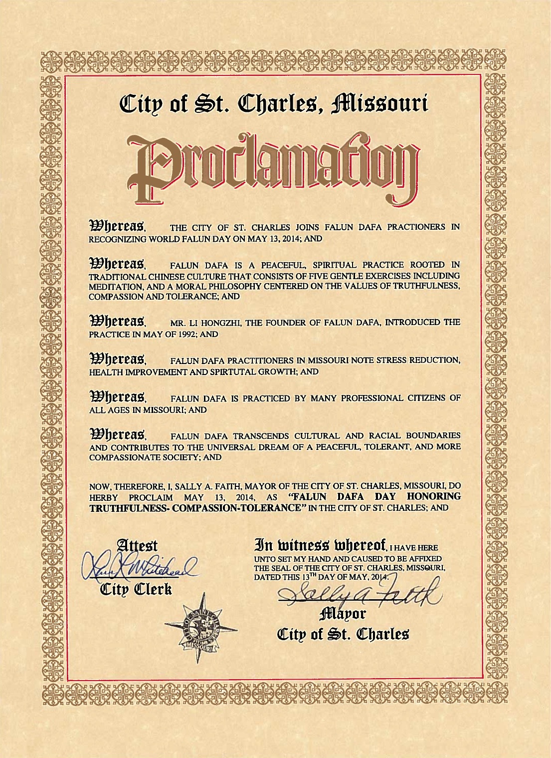 近日,美國密蘇裏州聖查爾斯市(St. Charles)市長莎莉•費斯(Sally A. Faith)頒發褒獎令,褒獎法輪大法,宣告二零一四年五月十三日為密蘇裏州聖查爾斯市「法輪大法日」。