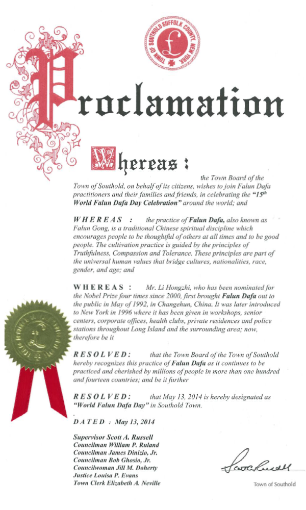 鑑於,法輪大法於一九九六年傳入紐約並在長島有十四年的傳播。