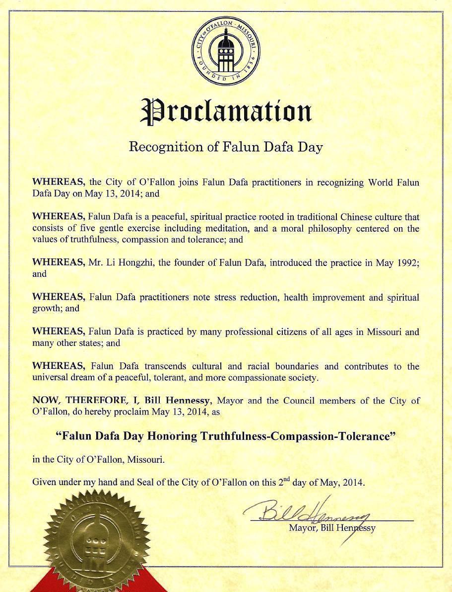 鑑此,我,奧法隆市(O'Fallon)市長Bill Hennessy,特此宣告二零一四年五月十三日為
