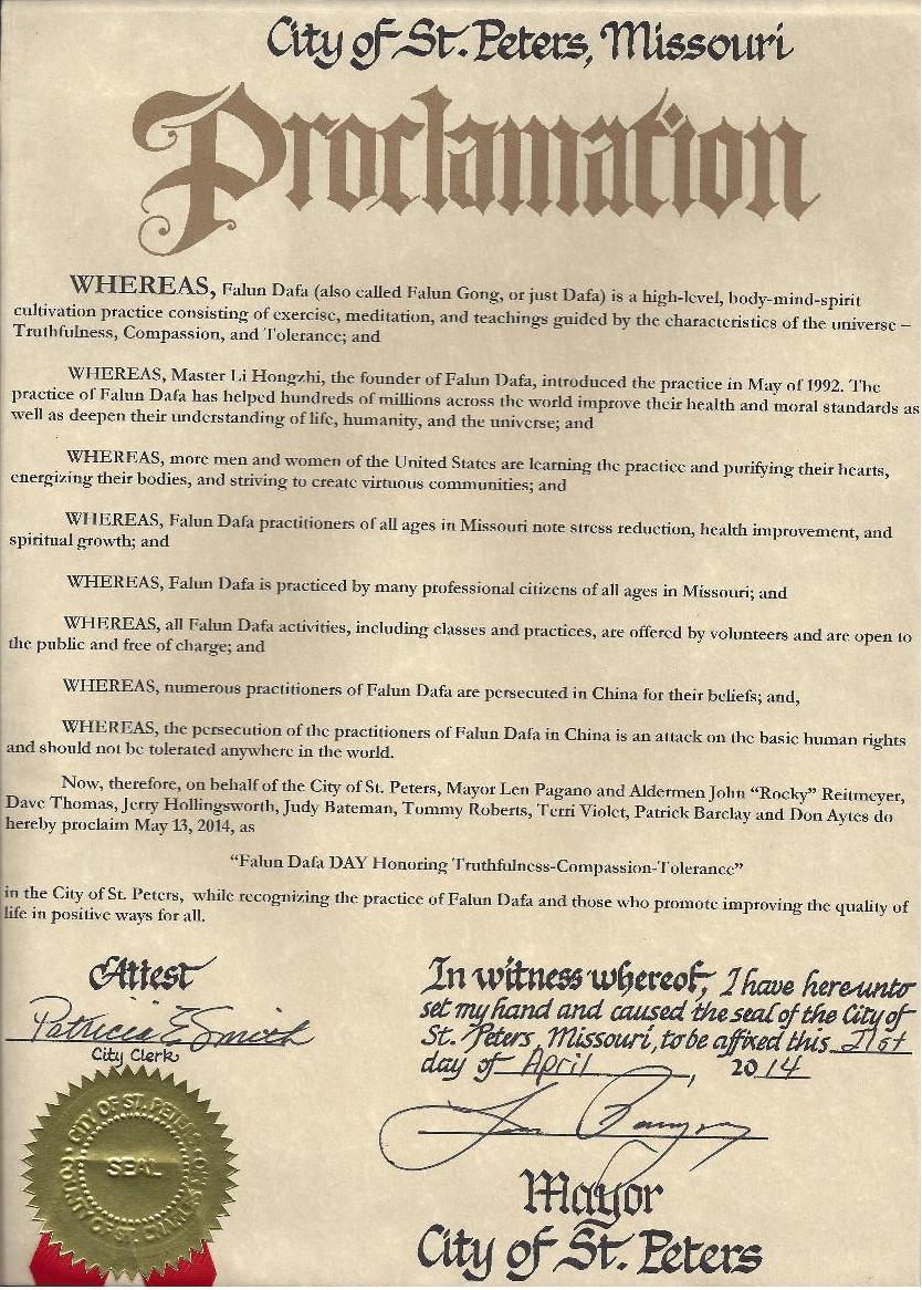 鑑此,我,密蘇裏州聖彼得市(St. Peters)市長雷納德•帕格諾(Len Pagano)和市議會議員們,特此宣告二零一四年五月十三日為聖彼得市