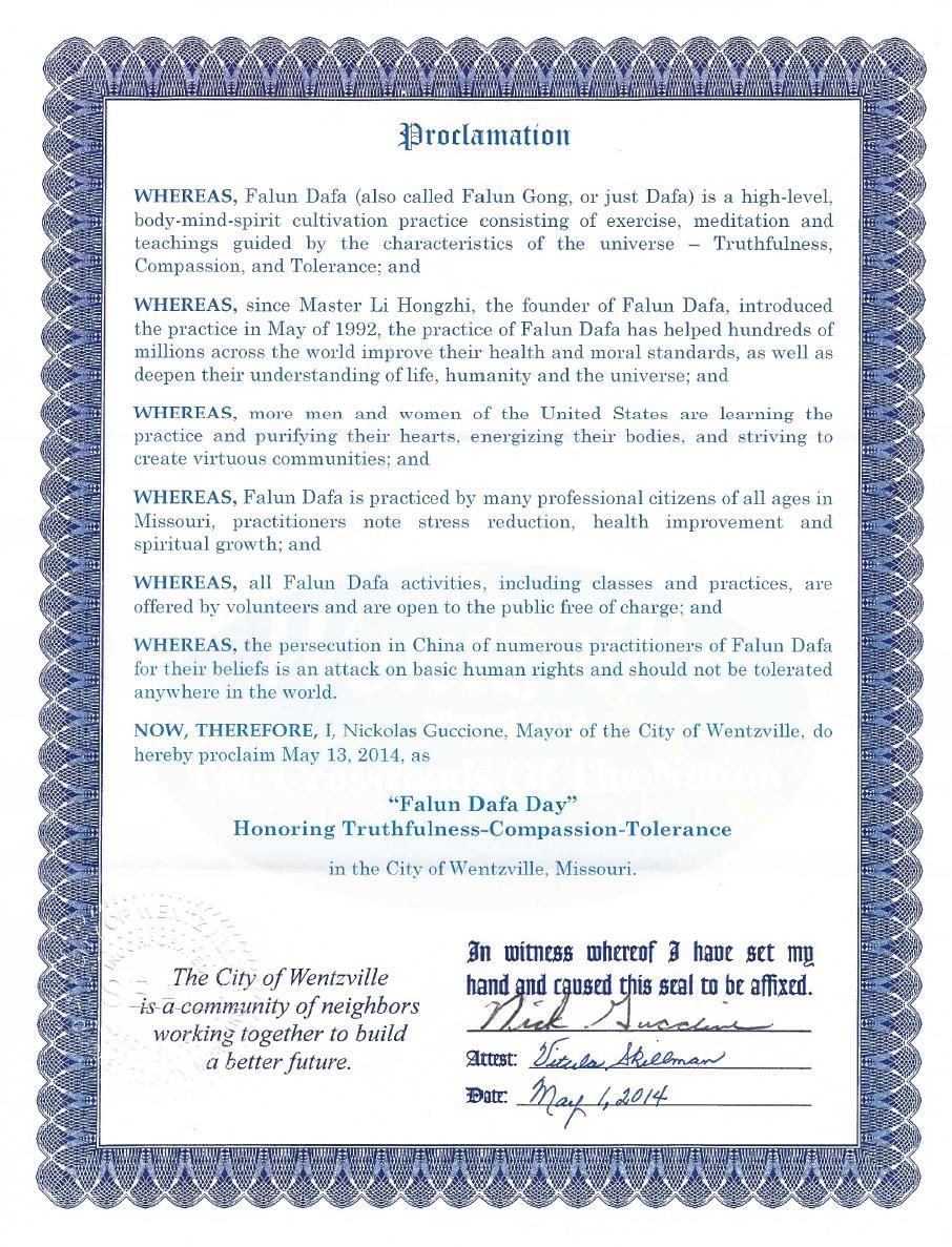 【明慧網二零一四年五月二十一日】美國密蘇裏州的聖彼得市(St. Peters)市長雷•帕格諾(Len Pagano)和溫茨維爾市(Wentzeville)市長尼克拉斯•古喬內(Nickolas Guccione)日前分別頒發褒獎,宣告二零一四年五月十三日為該市「頌揚真、善、忍的法輪大法日」。