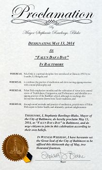 鑑此,我,巴爾的摩市市長斯蒂芬妮•羅林斯-布萊克(Stephanie Rawlings-Blake),特此宣布二零一四年五月十三日為巴爾的摩市「法輪大法日」,並鼓勵市民們按照各自的信仰一同加入到慶祝活動中。