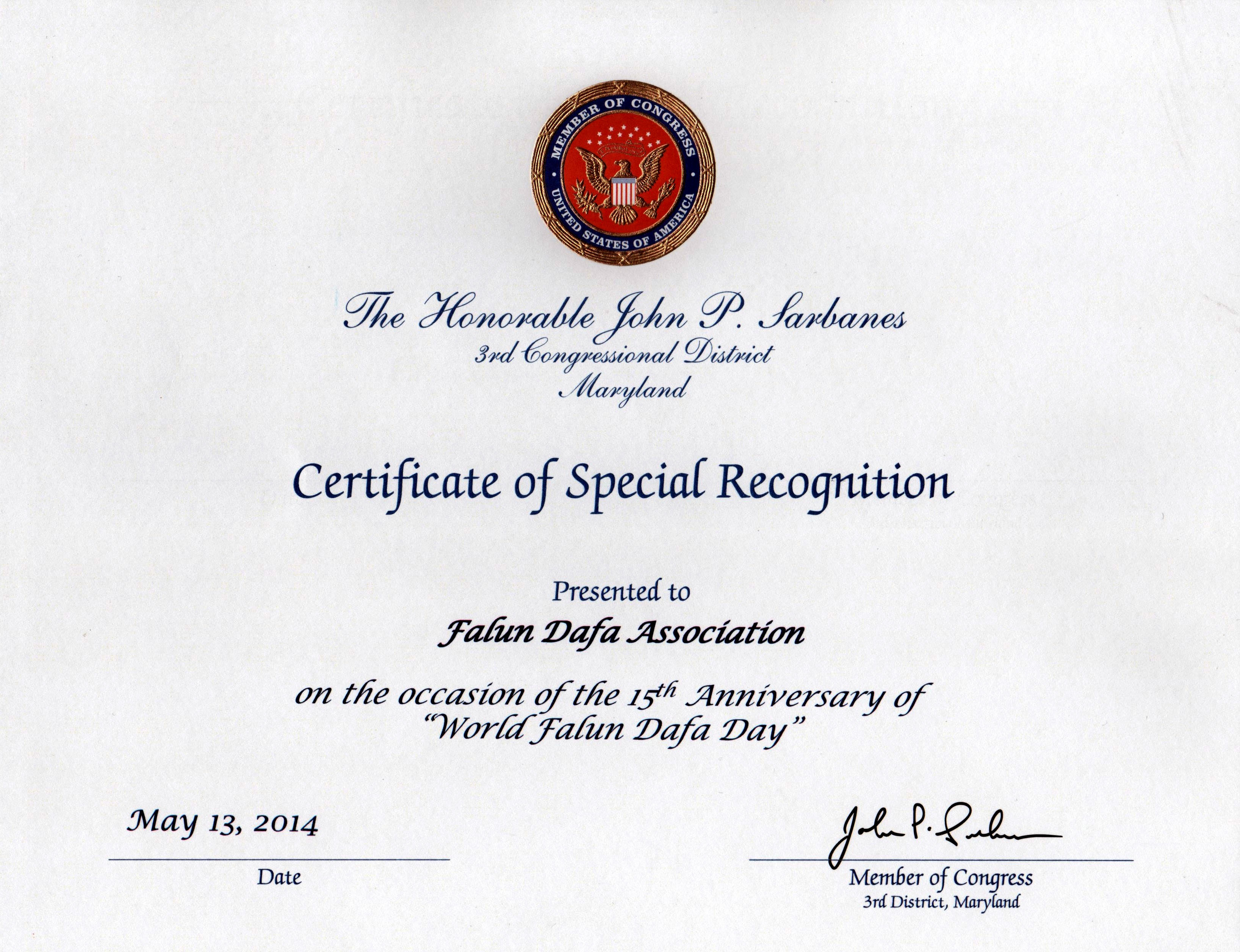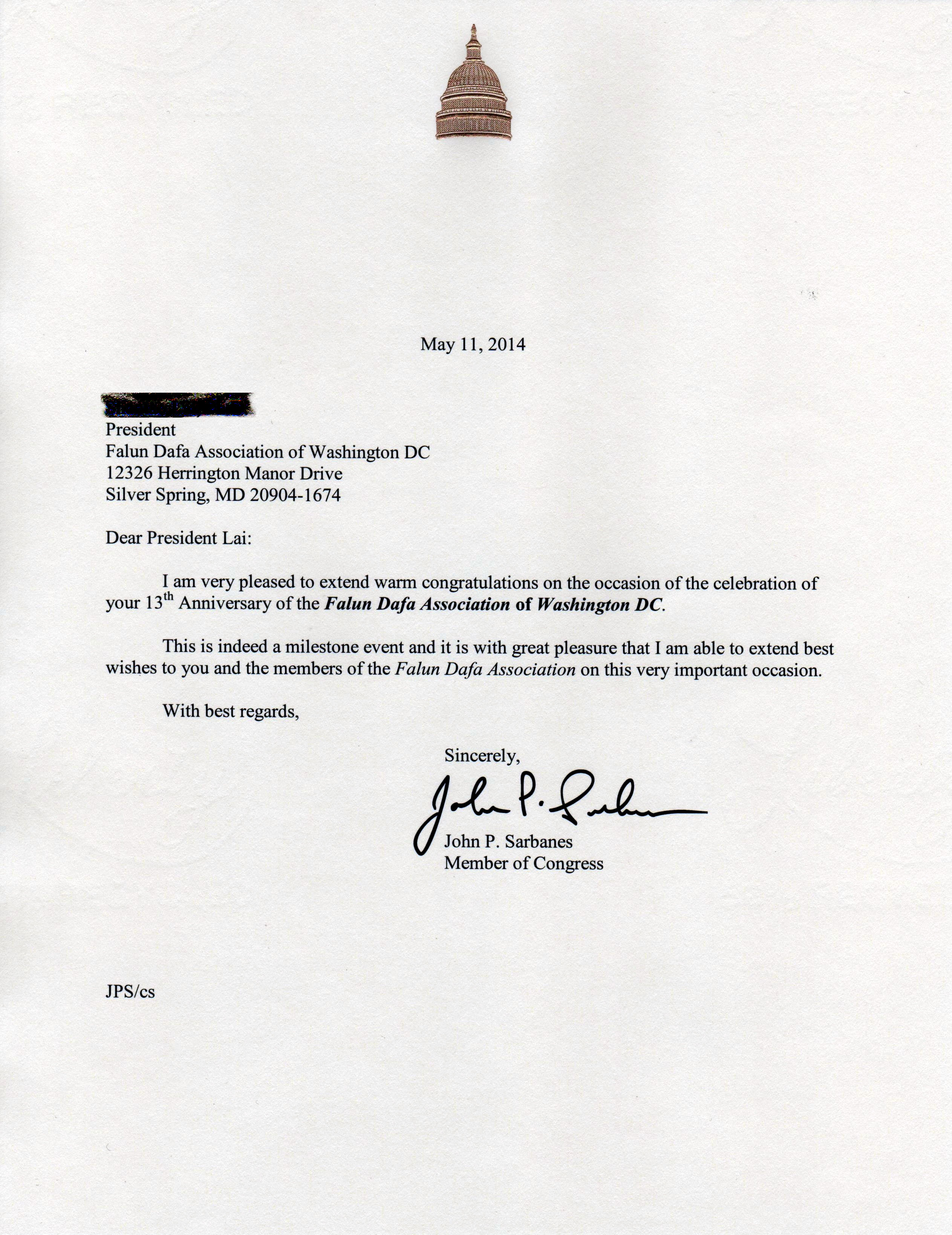 馬裏蘭州第三區的國會眾議員約翰•薩班斯(John Sarbanes)五月十一日和五月十三日分別發來褒獎和賀信。他說,在你們歡慶第十五屆世界法輪大法日之際,我非常愉快的向你們表達祝賀。這的確是個里程碑。值此重要時刻,我謹向你們和法輪大法學會的成員們致以最良好的祝願。