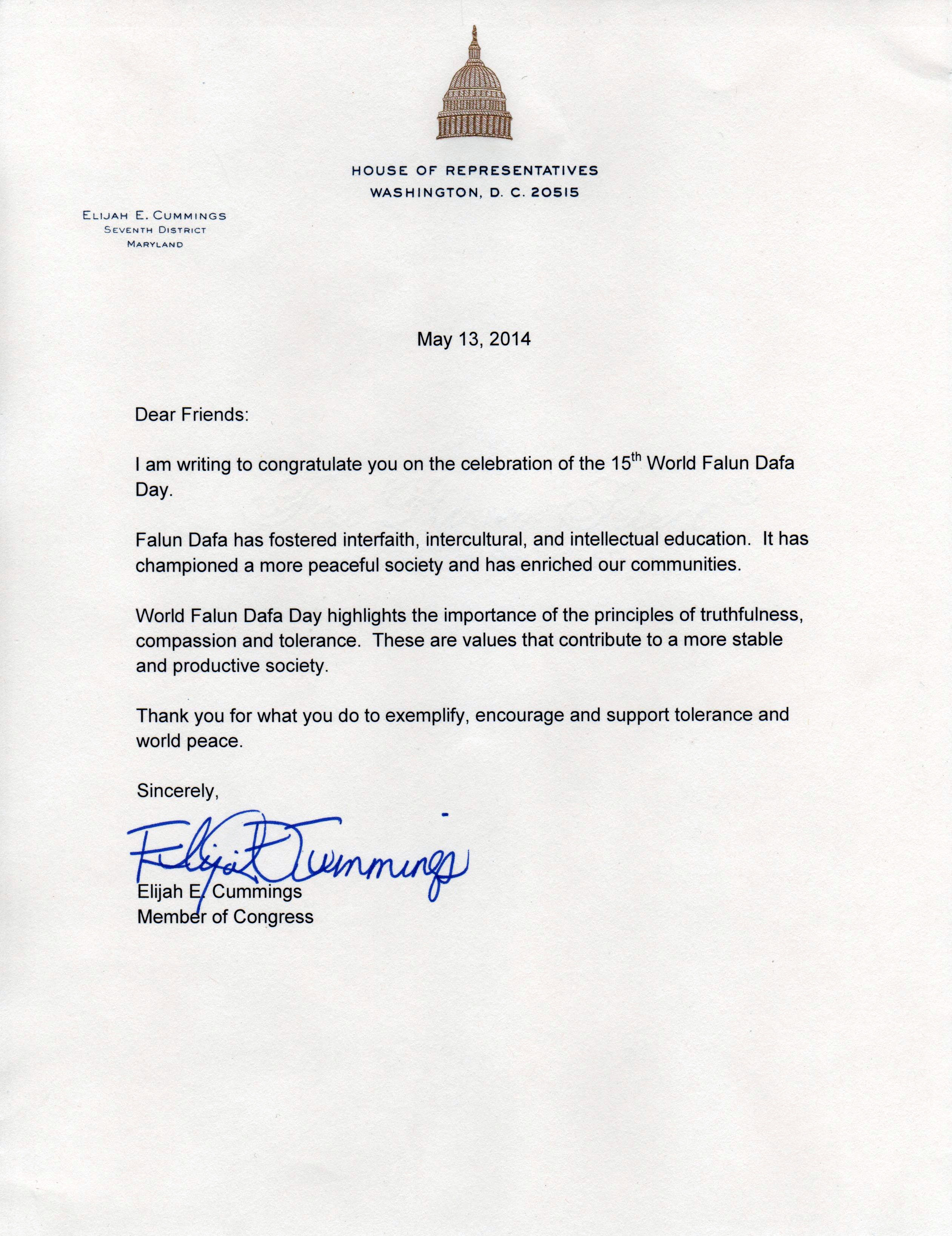 馬裏蘭州聯邦眾議員伊裏嘉•康民斯(Elijah E. Cummings)在五月十三日的賀信中說:「值此慶祝第十五屆世界法輪大法日之際,我向你們表示祝賀。法輪大法幫助人們樹立信仰、跨越文化界限和增加智育。