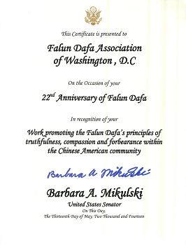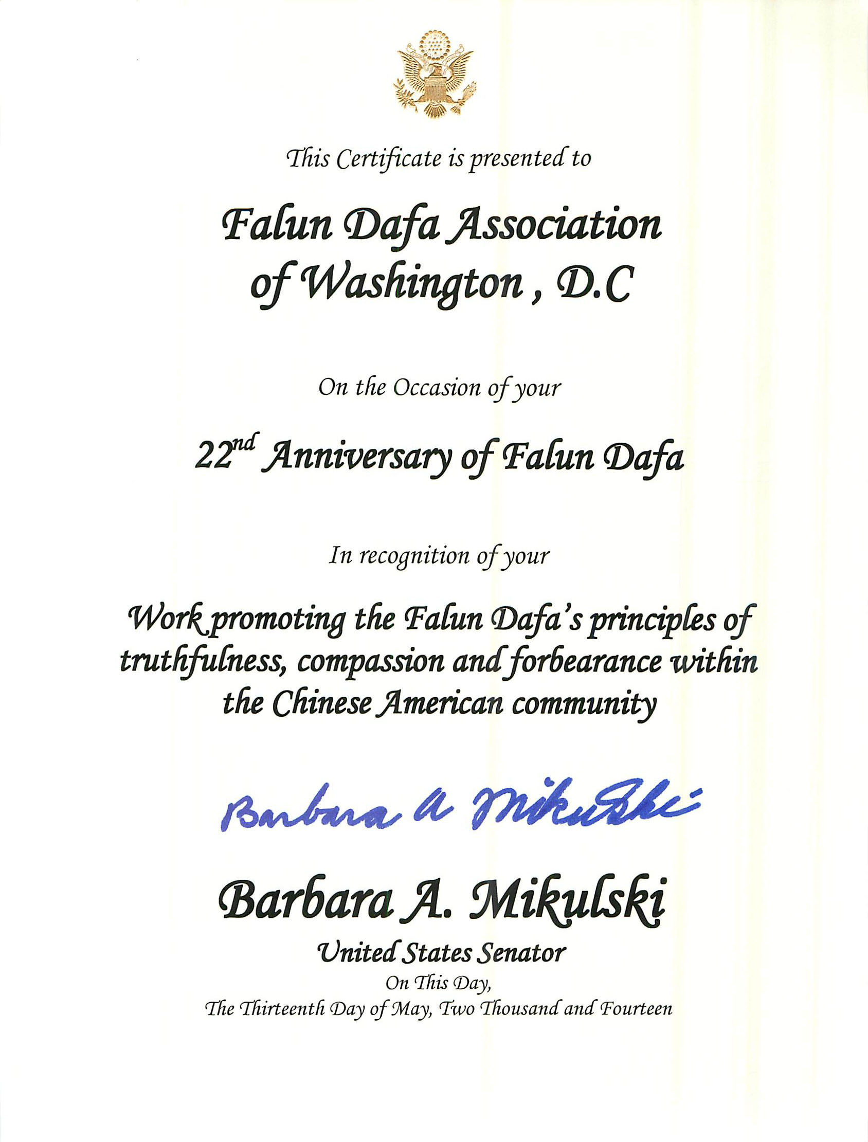 馬裏蘭州聯邦參議員芭芭拉•米庫斯基(Barbara Mikulski)五月十三日向華盛頓特區法輪大法學會發來褒獎,祝賀法輪大法弘傳二十二週年。她在褒獎信中讚賞法輪功學員在華裔美國人社區中提倡真、善、忍的原則。