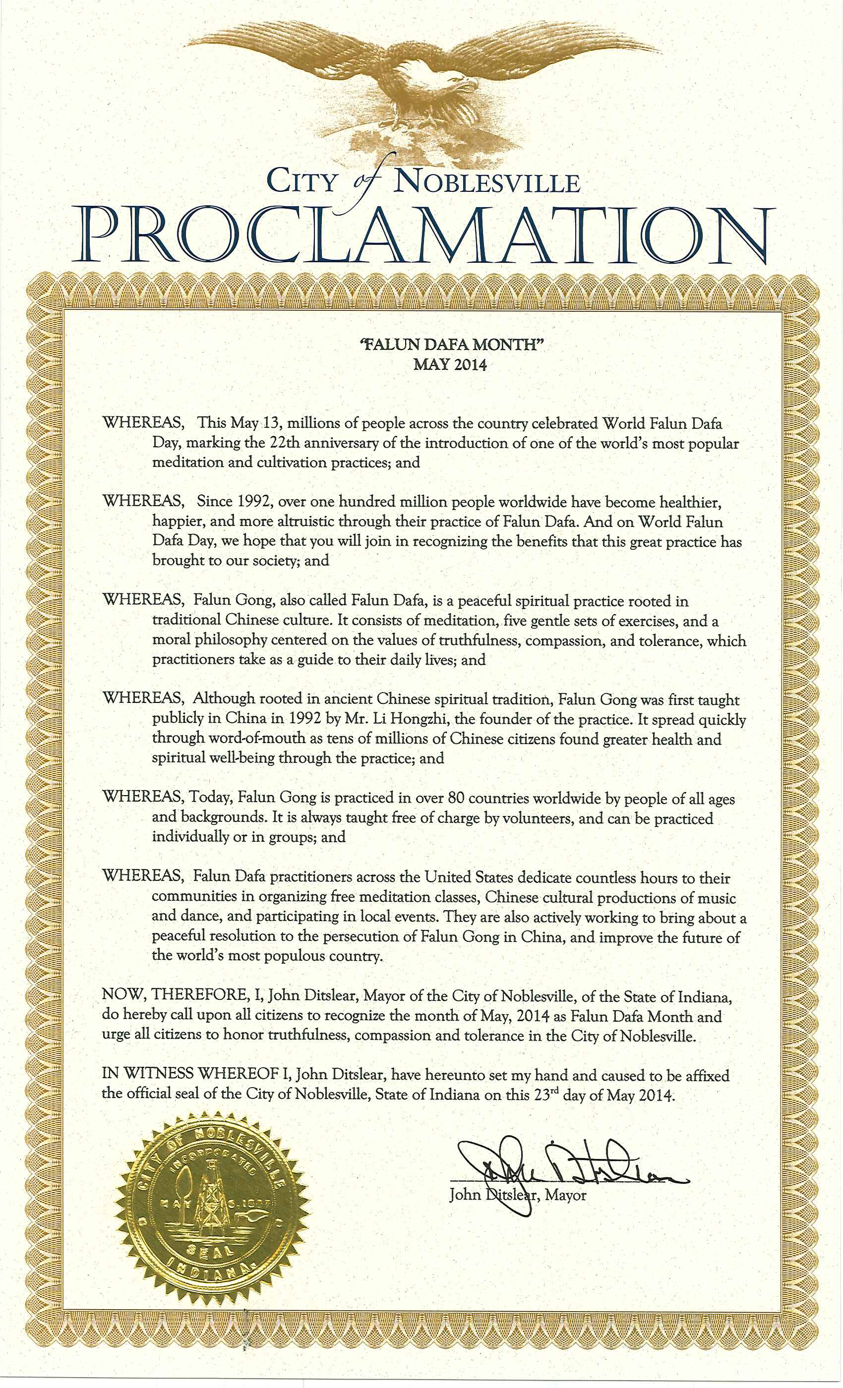 鑑此,我,美國印第安納州諾貝斯威爾市市長約翰•迪斯理爾,特此宣告二零一四年五月為「法輪大法月」,並呼籲所有市民頌揚真、善、忍。