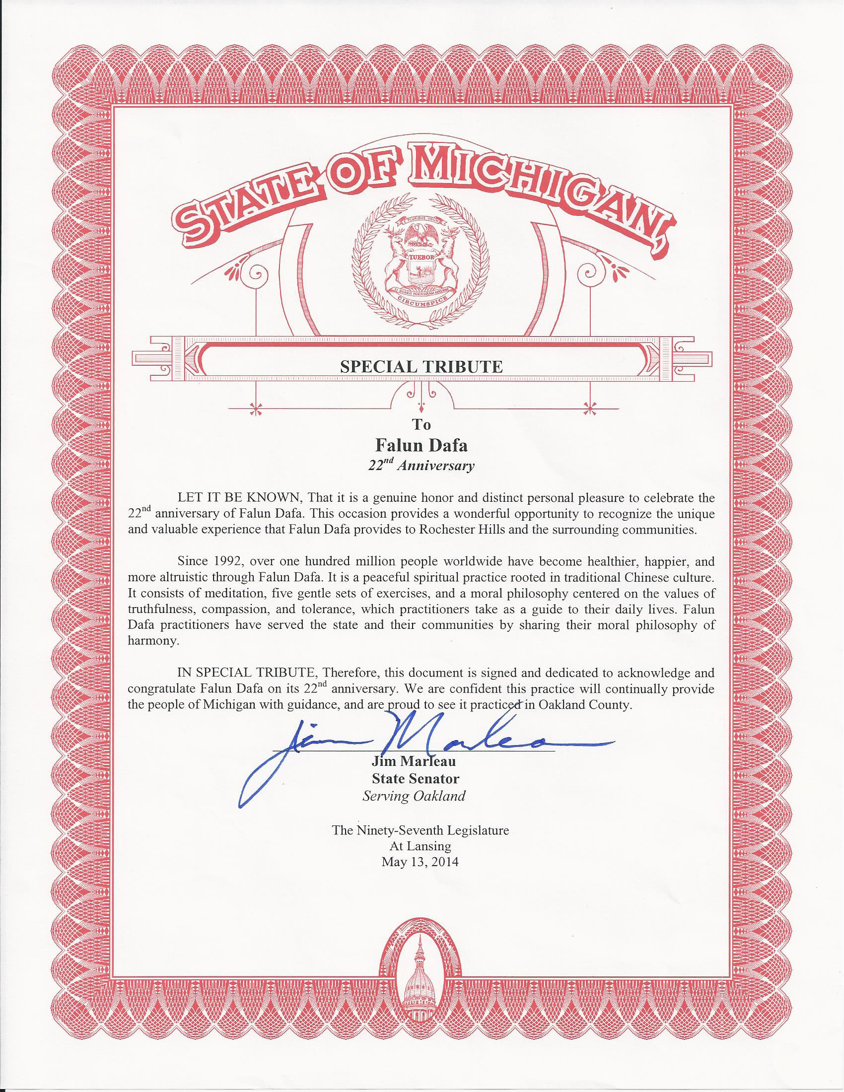 作為特殊的獎勵,因此簽署本文件,並致力於承認並祝賀法輪大法弘傳二十二週年,我們有理由相信,這種功法將繼續帶給密西根州人提供指導,並自豪地看到功法在奧克蘭縣(Oakland County)弘傳。