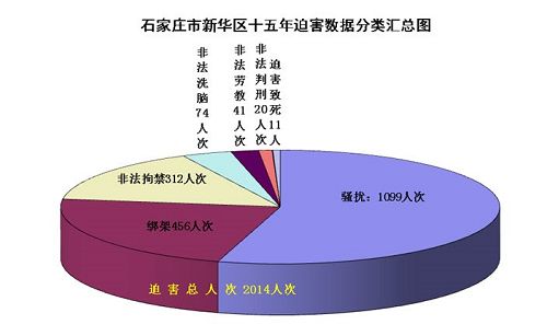 本文在統計中,對迫害總人次的計算是按新華區當局針對每一位法輪功學員實施一種迫害,就記一人次。比如:綁架算一次,非法拘禁又算一次,非法勞教\判刑\洗腦又算一次……;對騷擾人次的計算中:對明慧報導中「每逢敏感日就受騷擾」的許多典型案例:按10次騷擾計算的。