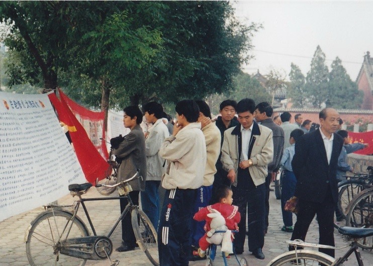 岱廟居於泰安古城的中心,南門的花園廣場上,遊人歇客頗多,法輪功學員把這裏當成了煉功弘法的重要場所。一到週六上午,就有上千名學員在這裏展示法輪大法五套功法。場地四週的樹幹上掛滿了介紹法輪功的圖片、資料,吸引了眾多路人觀看,很多人也因此走進大法修煉。