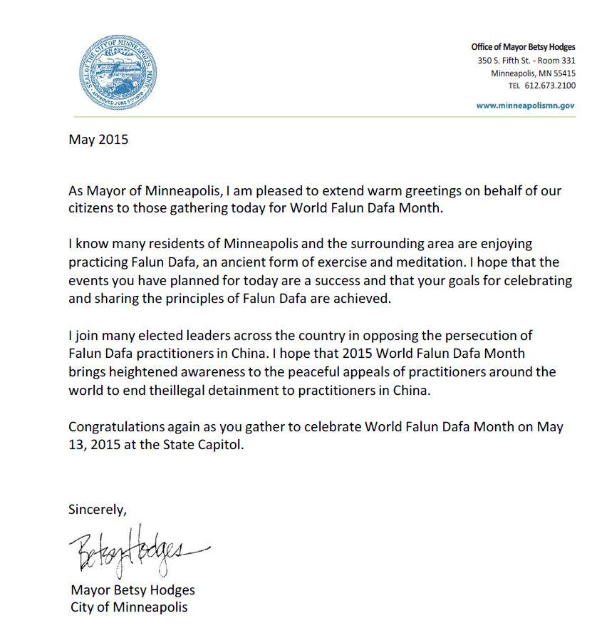 明州第一大城市──明尼阿波利斯市(Minneapolis)市長發來賀信,代表本市的居民向慶祝法輪大法月的民眾表示熱烈的祝賀。他在信中說:「我知道明尼阿波利斯及周邊地區的許多民眾喜愛修煉法輪大法──這一古老的健身及修行方法。我祝願慶祝活動圓滿成功,祝願你們慶祝及分享法輪大法理念的目的圓滿達成。」
