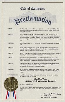 鑑於,明尼蘇達州羅切斯特市加入全世界法輪大法修煉者共同慶祝五月十三日的世界法輪大法日;