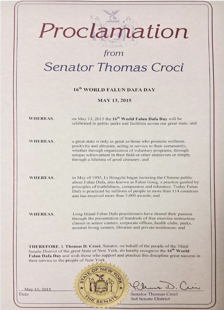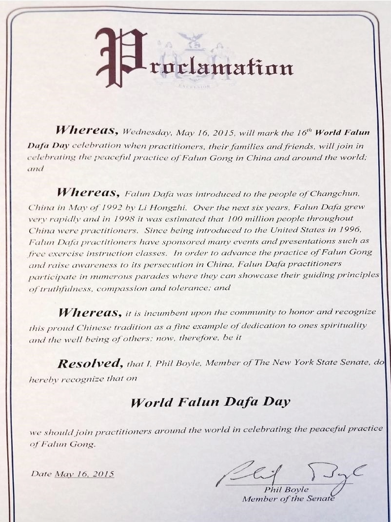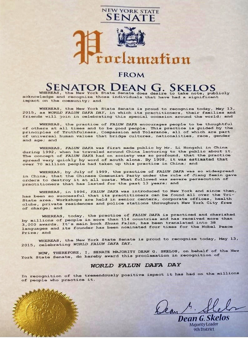【明慧網二零一五年五月二十日】美國紐約州六名參議員在法輪大法洪傳二十三週年,第十六屆法輪大法日之際,發來褒獎,祝賀法輪大法日,稱頌法輪大法「真、善、忍」的原則,讚揚修煉功法幫助了上億的人改善身體健康。