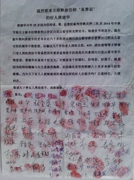 唐建華,女,55歲,貴州新華印刷廠退休工人。2014年9月8日中午向路人散發《九評共產黨》書籍時,被正在巡邏的貴陽市雲岩區黔靈東路派出所民警綁架到黔靈東路派出所,現非法關押在貴陽市雲岩區看守所。2010年唐建華女士曾經被迫害非法勞教一年半。2015年4月3日貴陽市雲岩區法院對唐建華非法判處有期徒刑四年(從2014年9月16日起至2018年9月7日止)。現家屬已請律師介入,向貴陽市中級人民法院提出上訴。請看到消息的貴州同修及海內外同修和善良人士共同營救唐建華女士,無條件釋放法輪功學員。