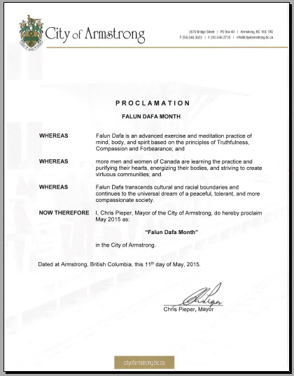 【明慧網二零一五年五月二十三日】二零一五年五月十一日,加拿大不列顛省阿姆斯特朗市市長Chris Pieper頒發褒獎令,讚揚「法輪大法超越了文化和種族的界限,並繼續為創建和平,寬容,更富有同情心的社會普世價值和夢想努力。」