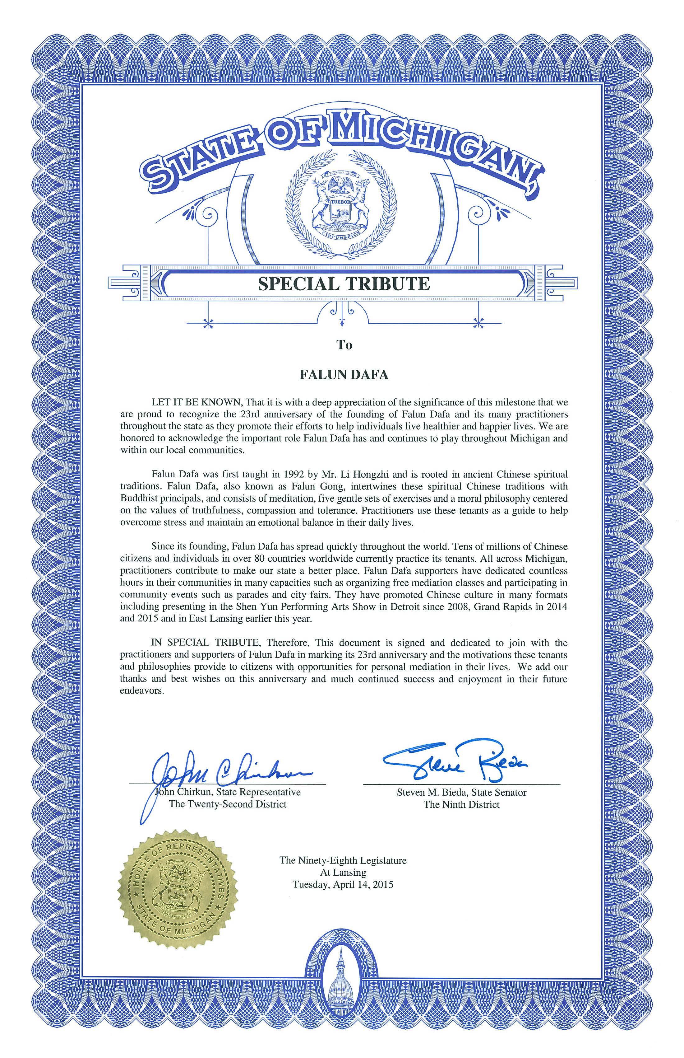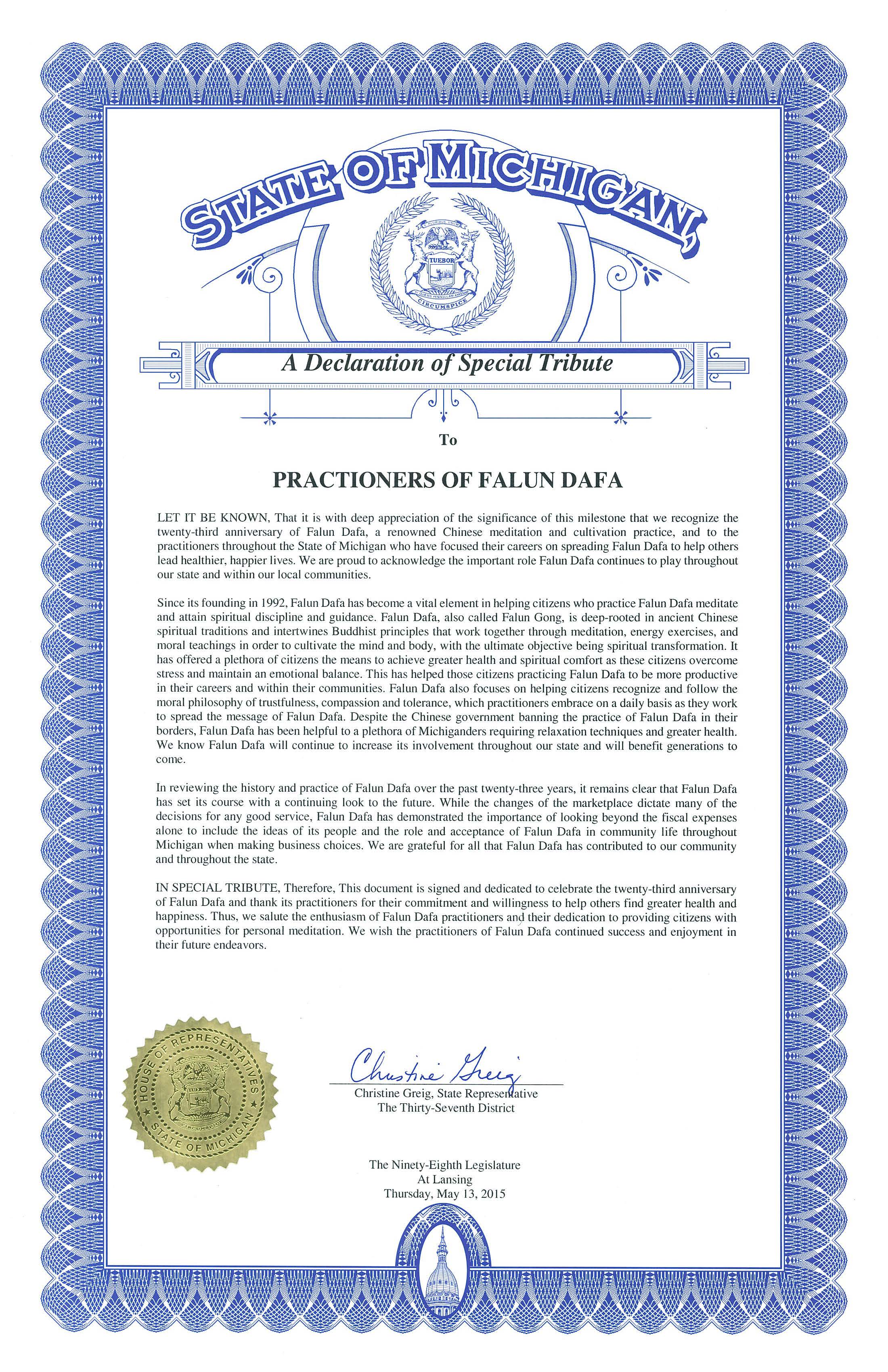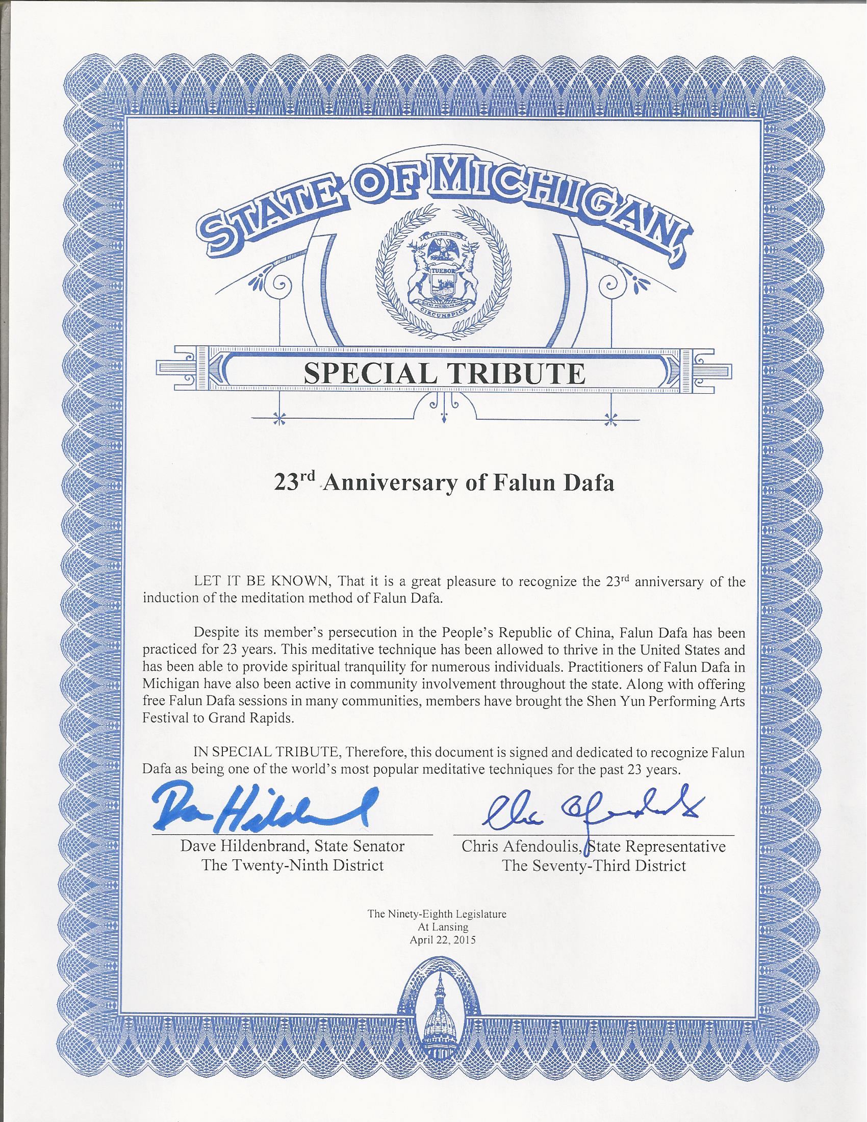 州參議員Dave Hildenbrand和州眾議員Chris Afendoulis的聯合感謝信中說:「在過去的二十三年裏,感謝法輪功這種打坐方式已經在美國得到廣泛傳播,能夠為眾多民眾帶來精神上的安寧,密西根州的法輪功學員們也一直活躍在各個社區活動中。」