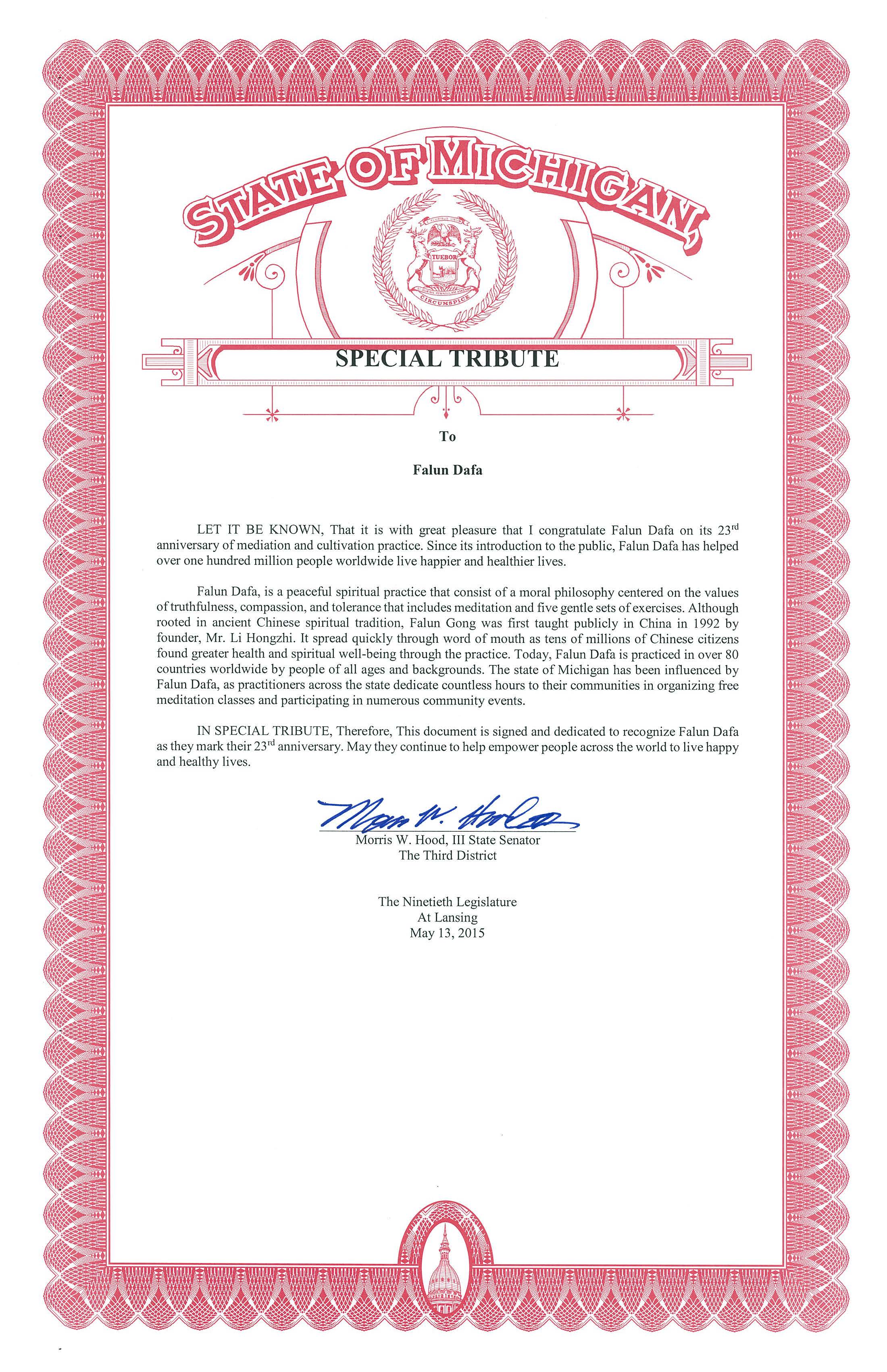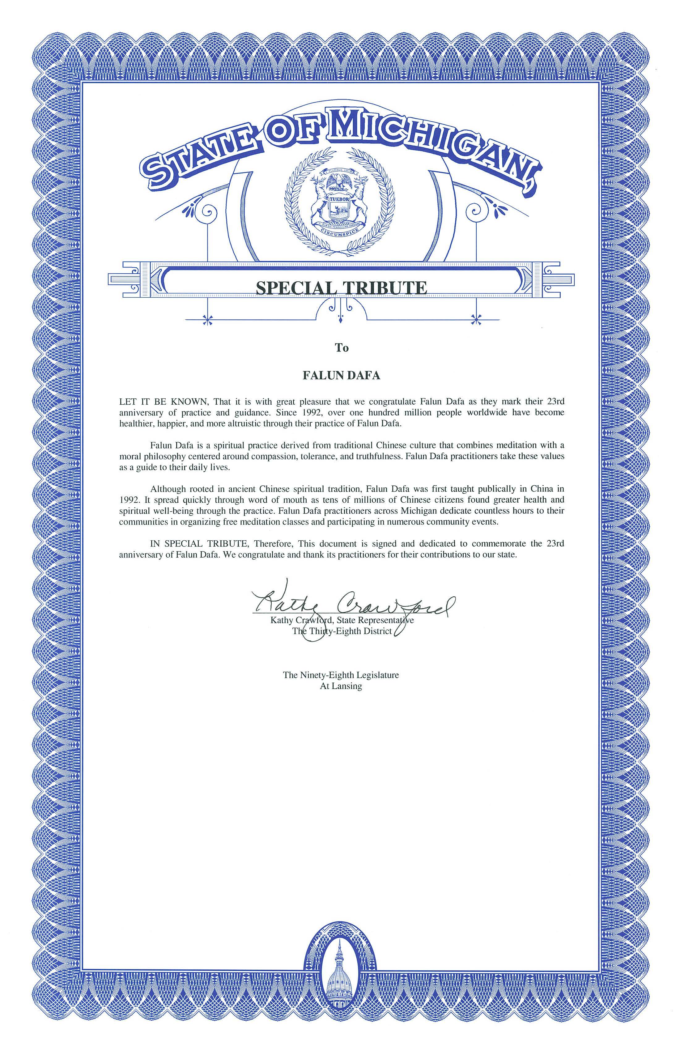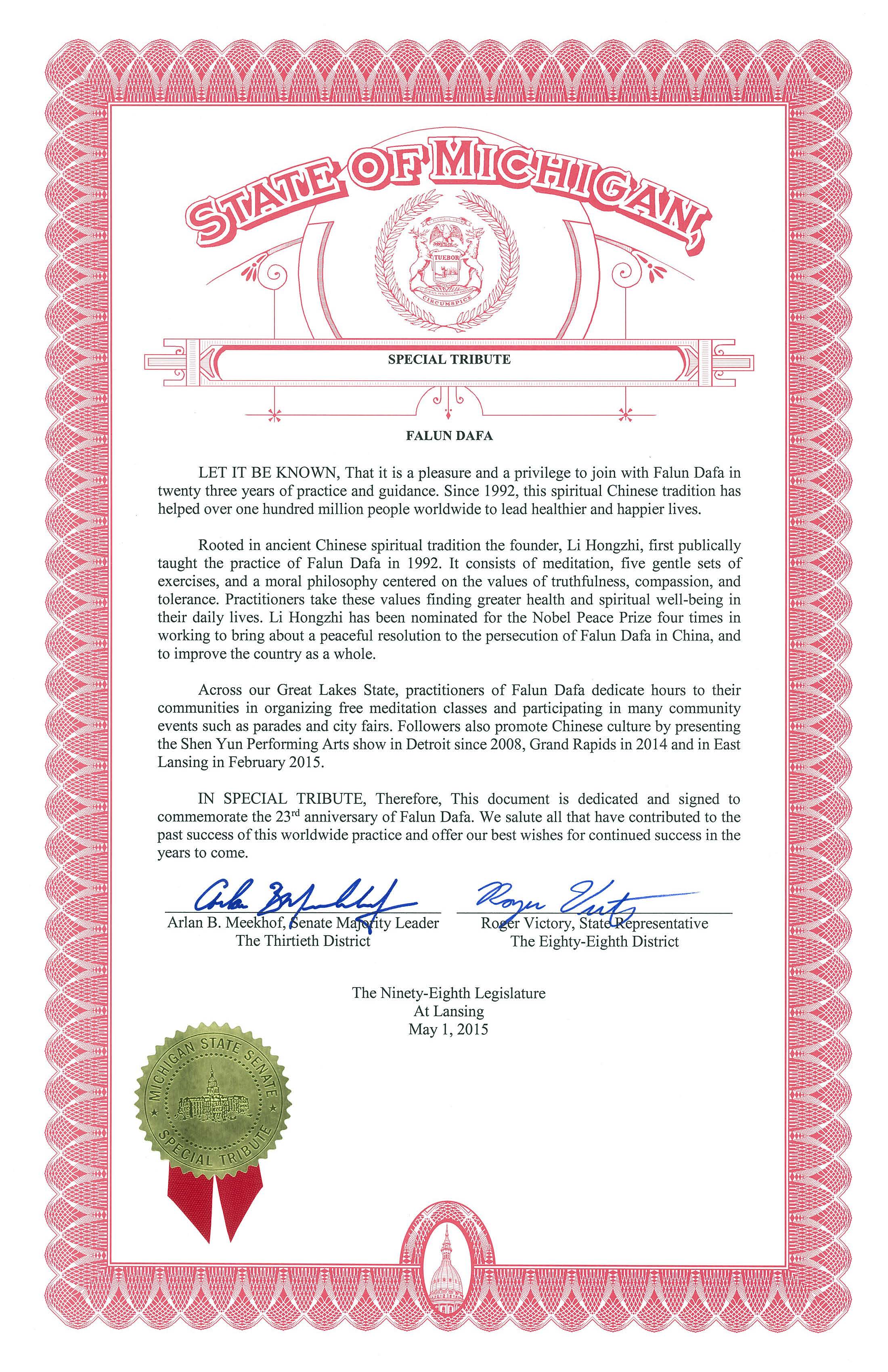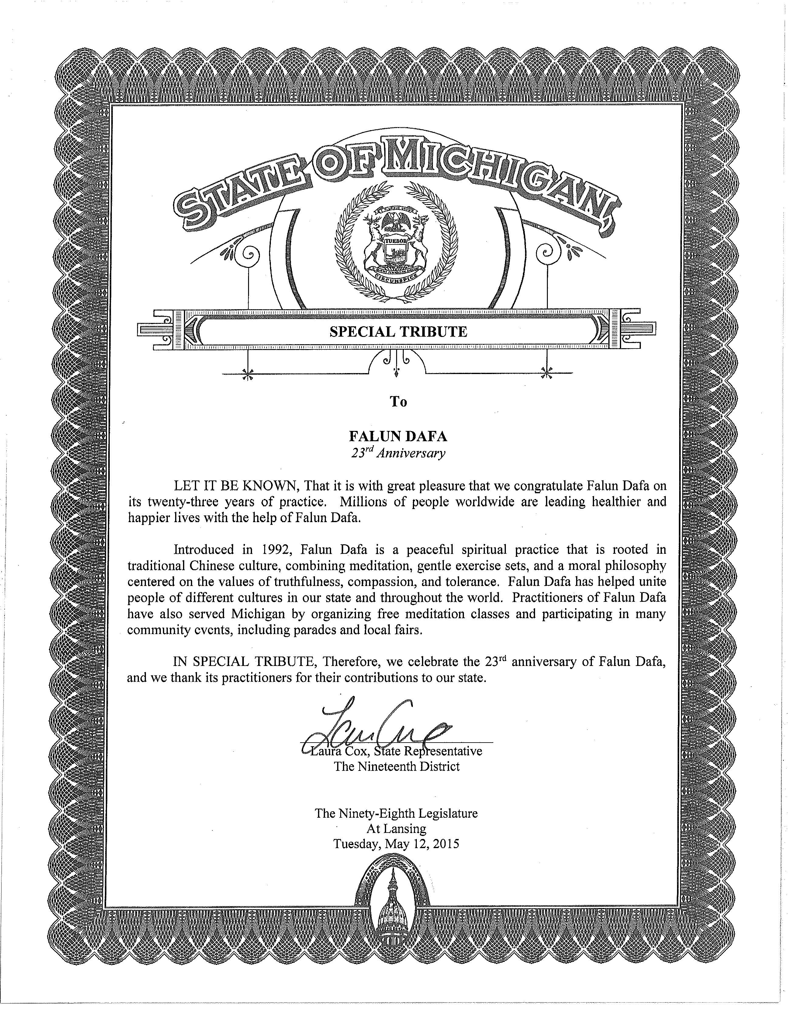 州參議員Dave Hildenbrand和州眾議員Chris Afendoulis的聯合感謝信中說:「在過去的二十三年裏,感謝法輪功這種打坐方式已經在美國得到廣泛傳播,能夠為眾多民眾帶來精神上的安寧,密西根州的法輪功學員們也一直活躍在各個社區活動中。」