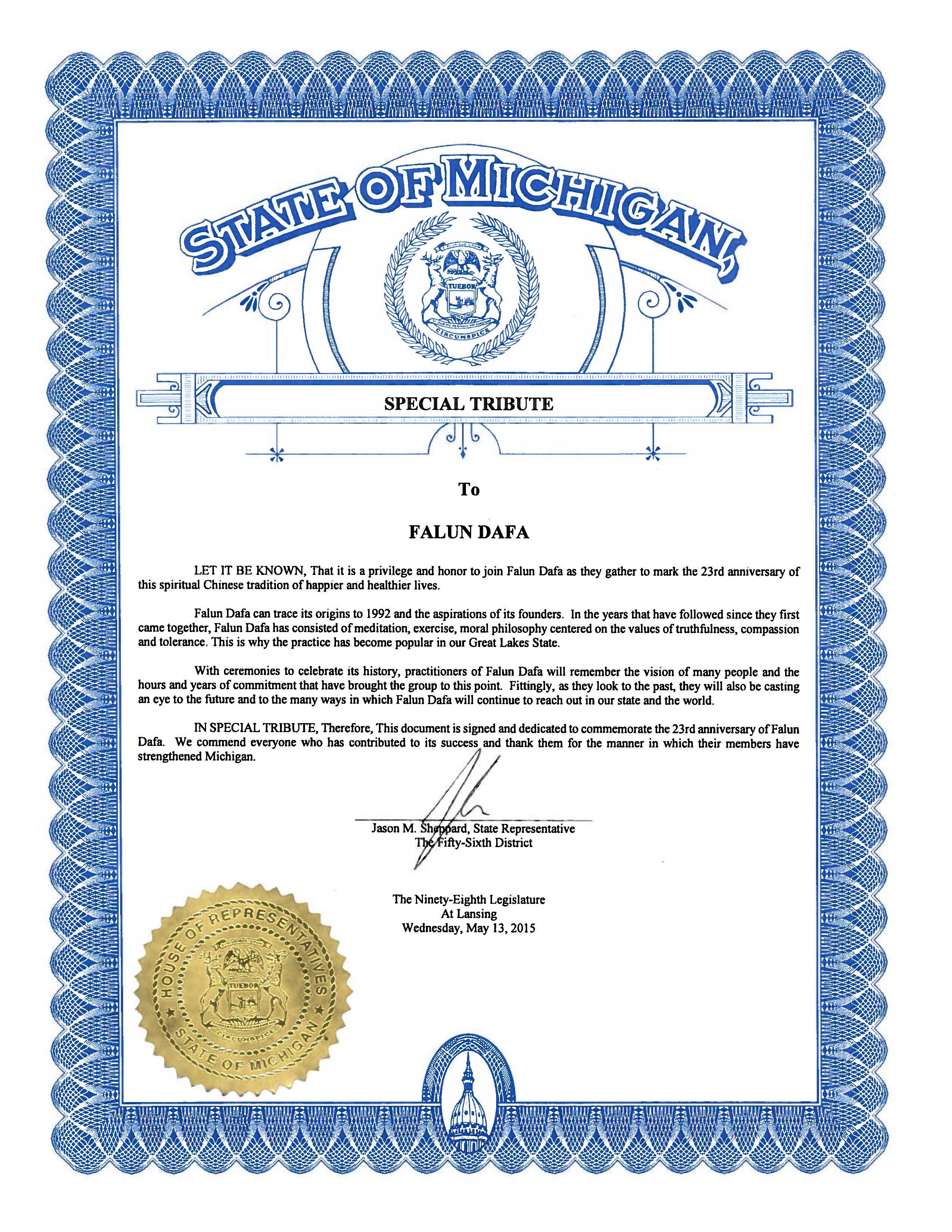 第五十六區州眾議員Jason Shappard說:「在慶祝法輪大法弘傳二十三週年之際,法輪功學員們沒有忘記他們日復一日,年復一年所付出的努力走到今天,回顧歷史,展望未來,他們會以更多地方式服務於這個國家和世界。」「我們感謝他們所做出的貢獻,他們使密西根州更加強大。」