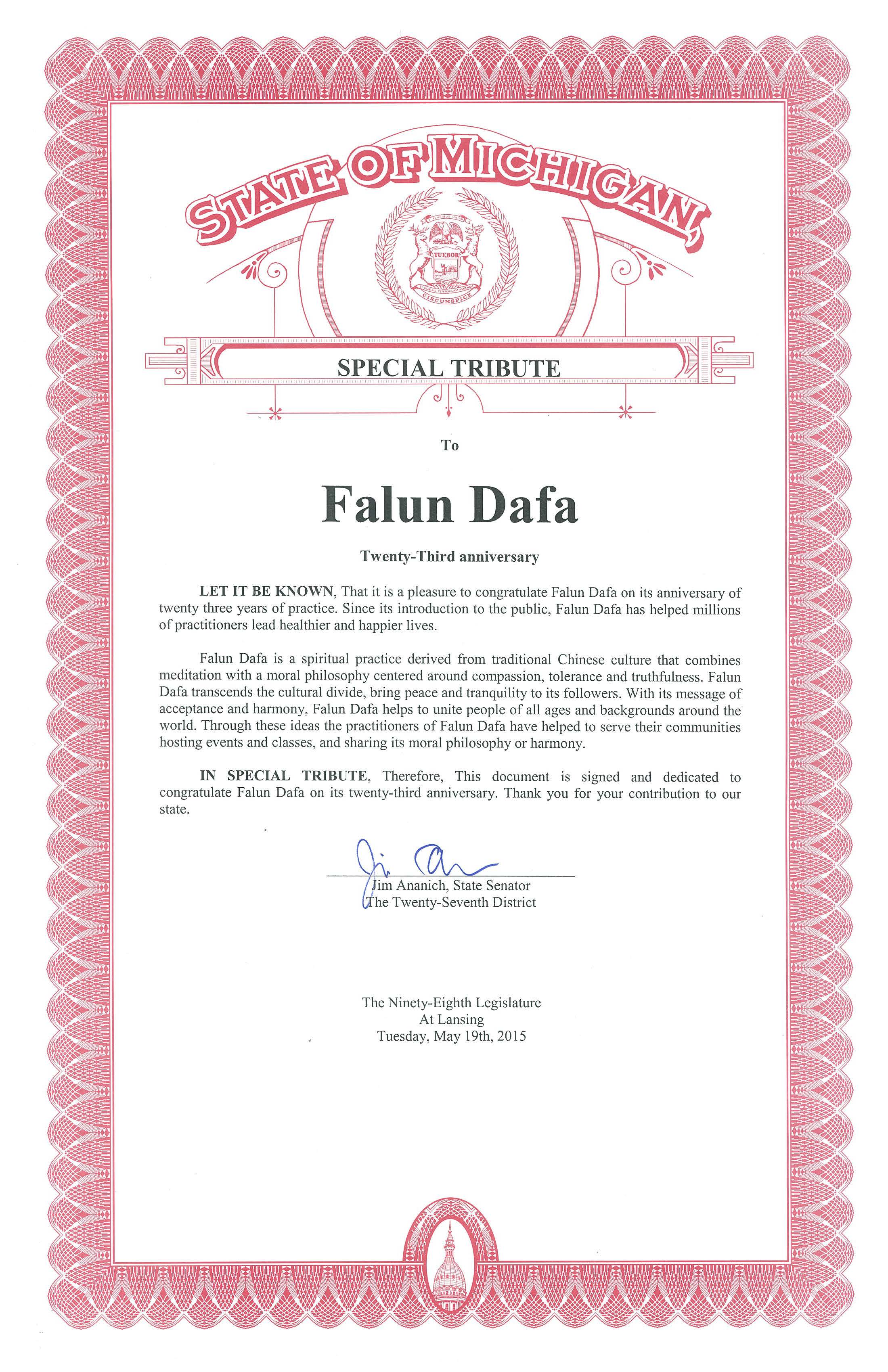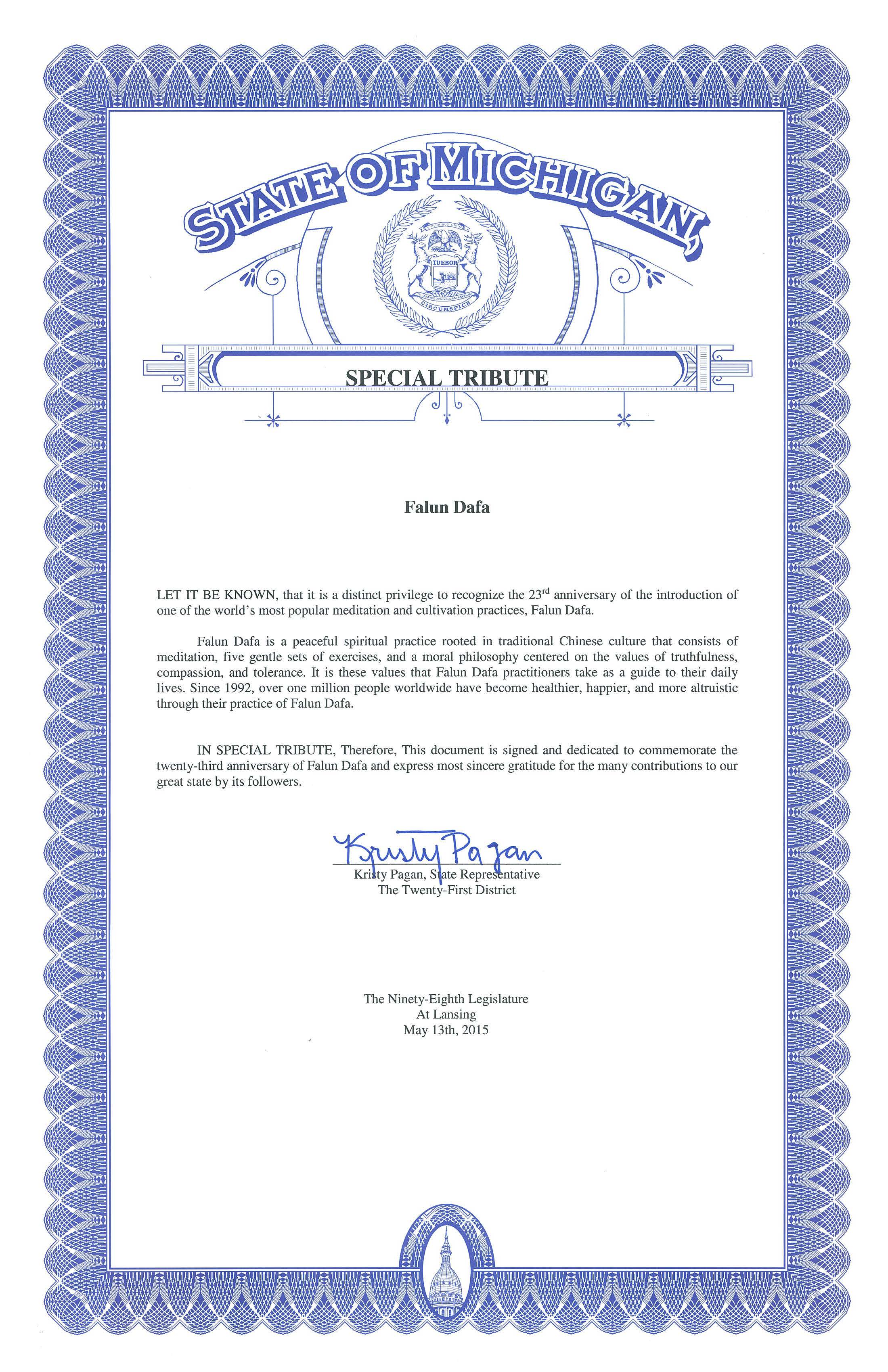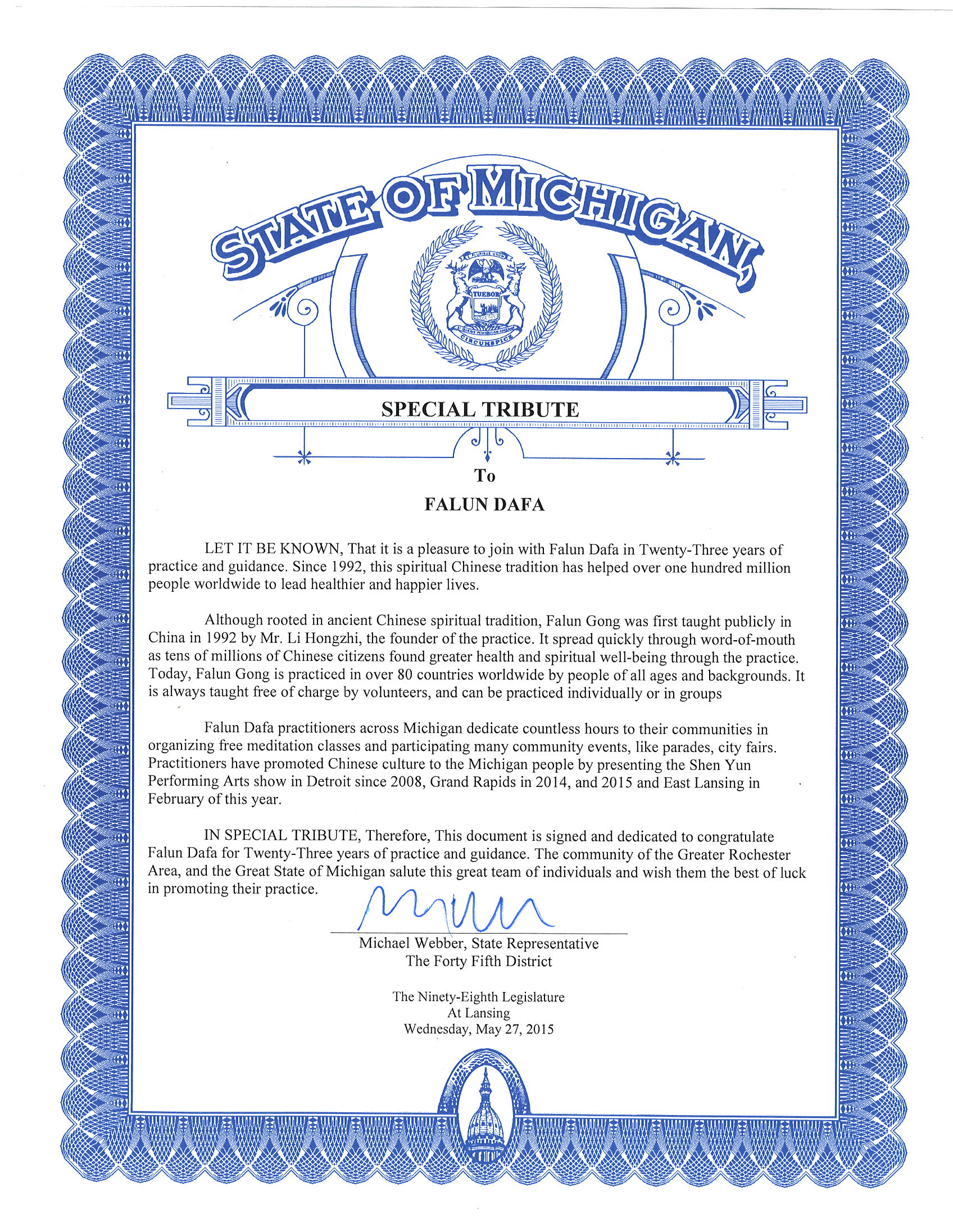 第四十五區州眾議員Michael Webber在感謝信中最後寫道:「我簽署本文件,在法輪大法弘傳二十三週年之際,在大羅徹斯特地區和密西根州,向這個偉大的團體致敬,並祝他們在社區裏有更多地弘法活動。」