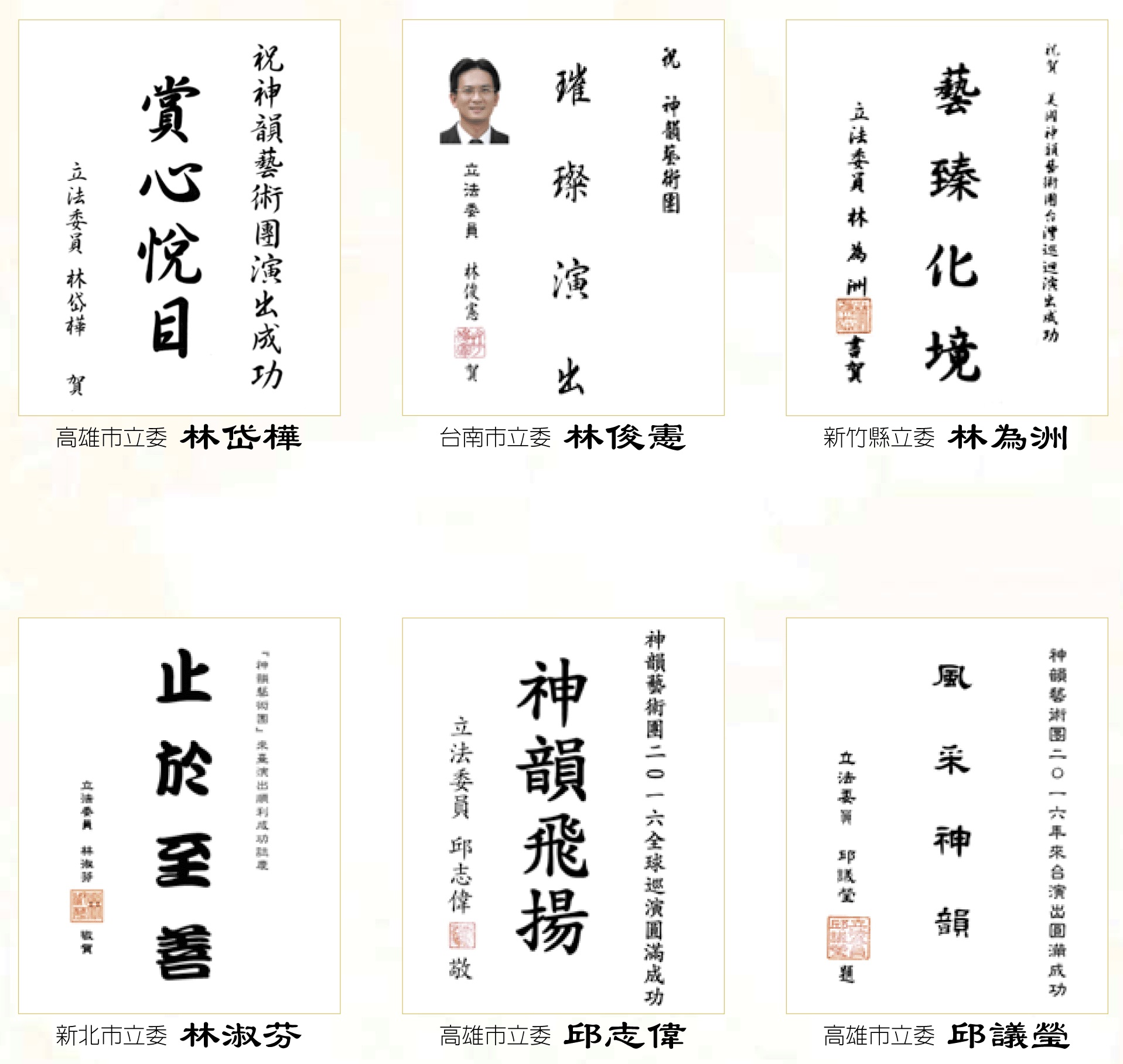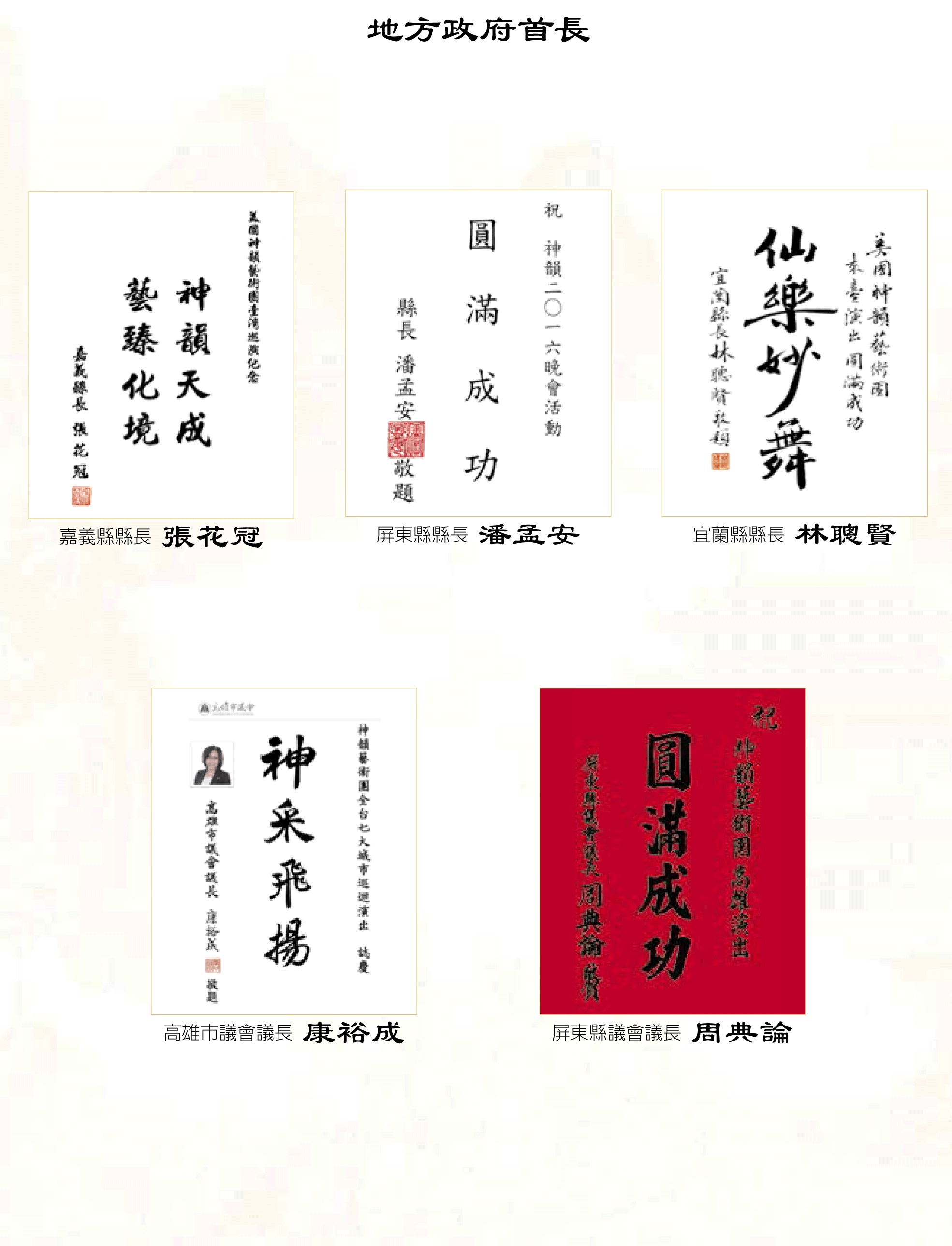 ![]() 圖6:台灣各縣市首長與議長髮賀詞歡迎神韻蒞臨 |