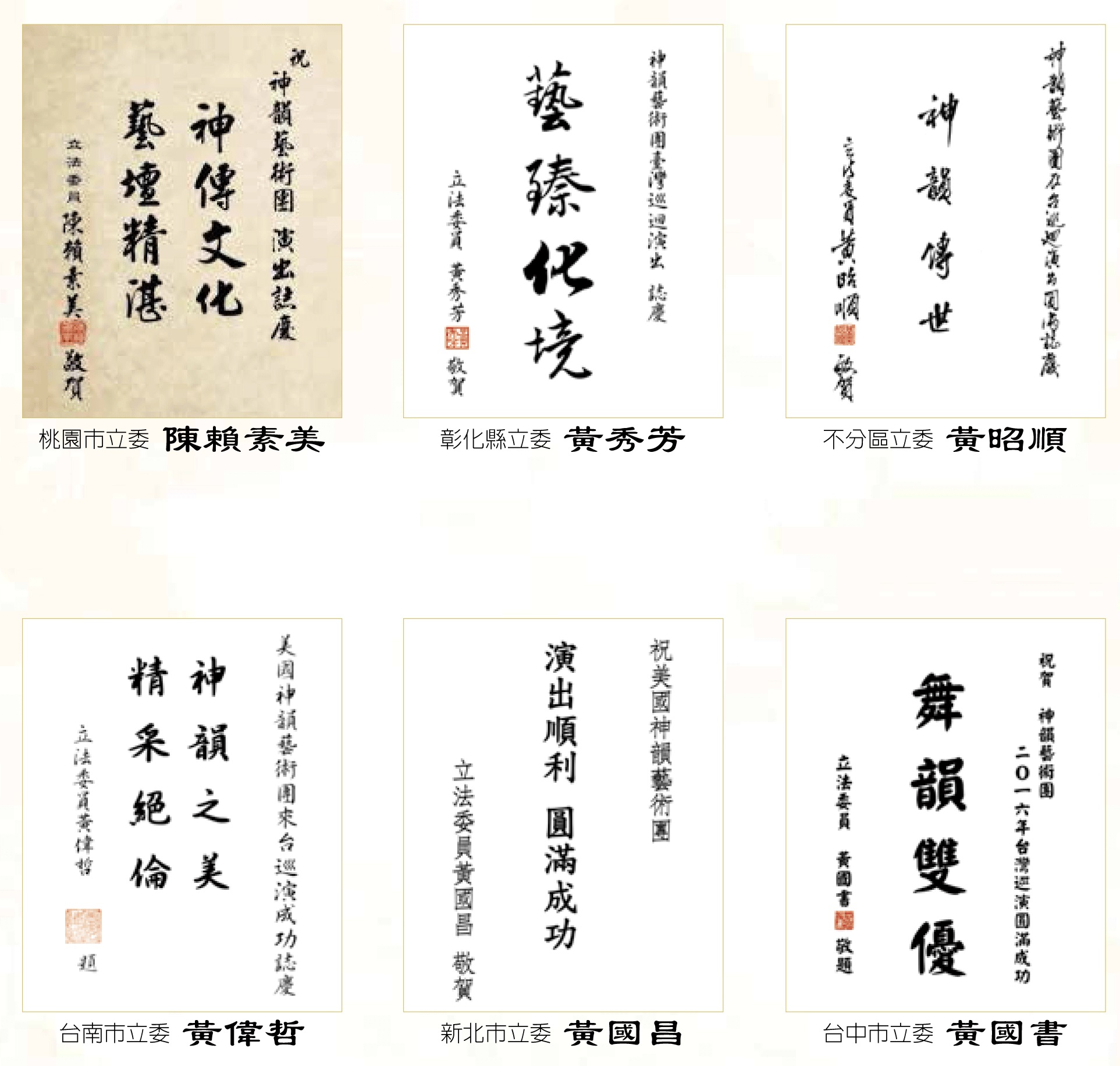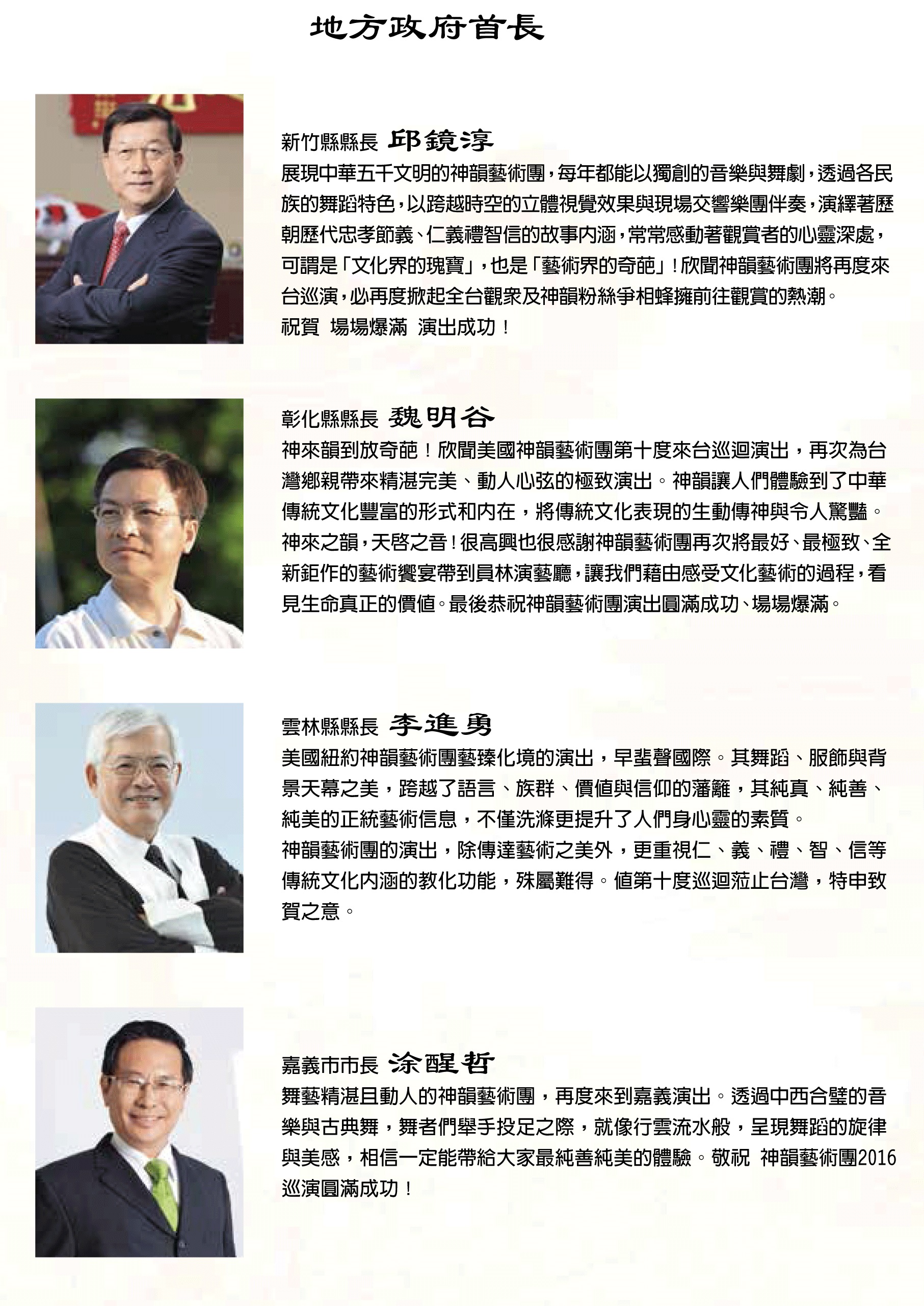 台中市市長林佳龍的賀文中寫道:「神韻藝術團的節目以卓越的藝術形式演繹敬天重德及忠孝節義等傳統價值的內涵,實與台中文化城的核心精神契合。」台南市長賴清德也讚揚道:「來自美國紐約神韻藝術團,以古典民族舞蹈攜手中西合璧交響樂隊,不但將藝術表演推向真善美境界,也厚實了台南的文化底蘊。謹祝福2016來台巡演成功!」