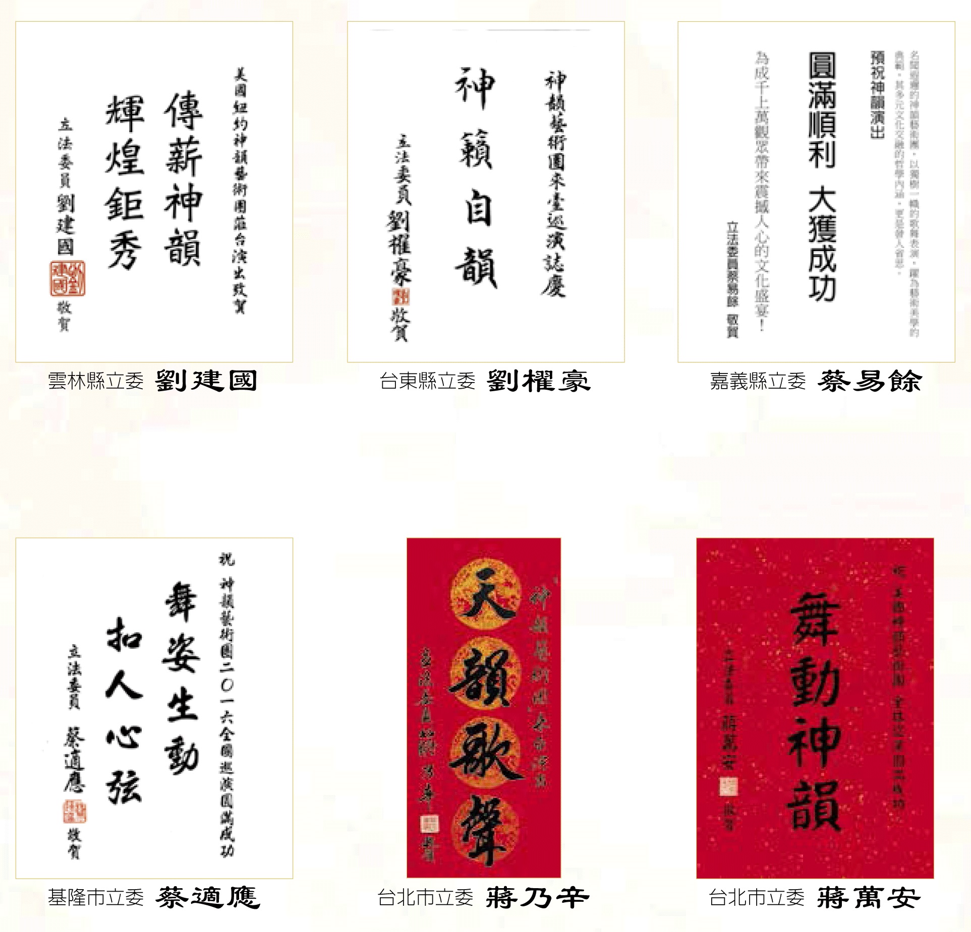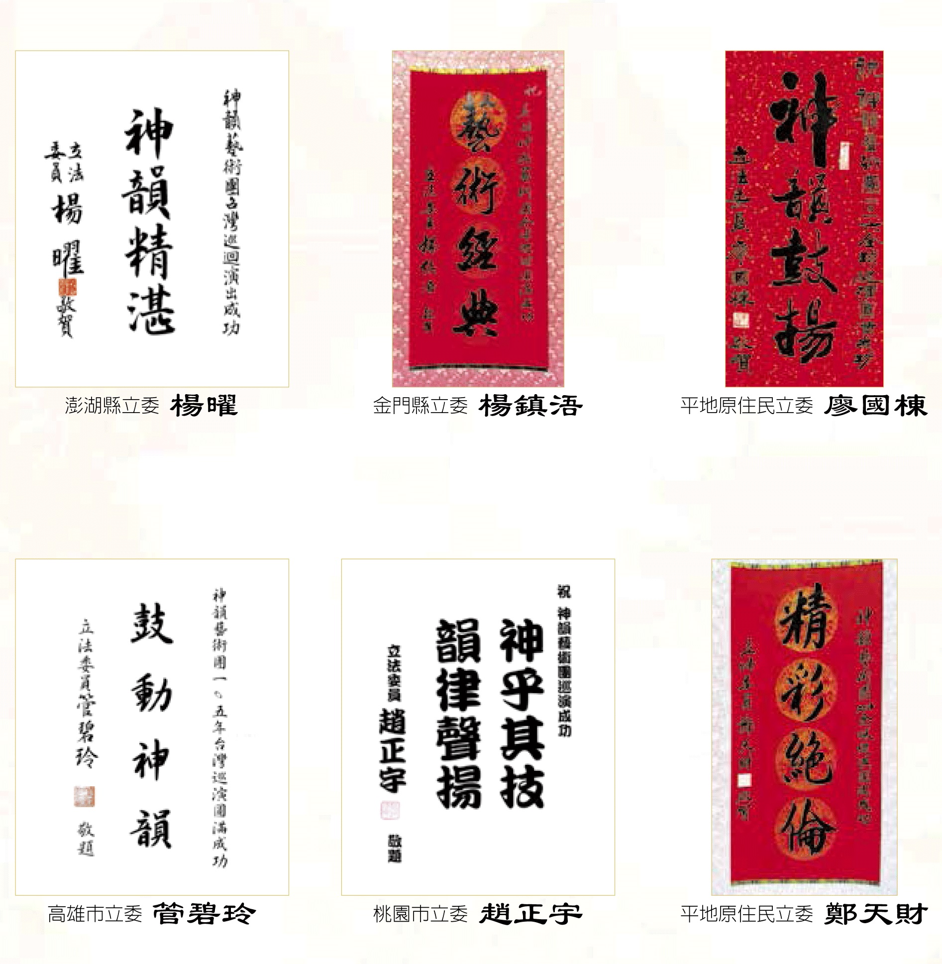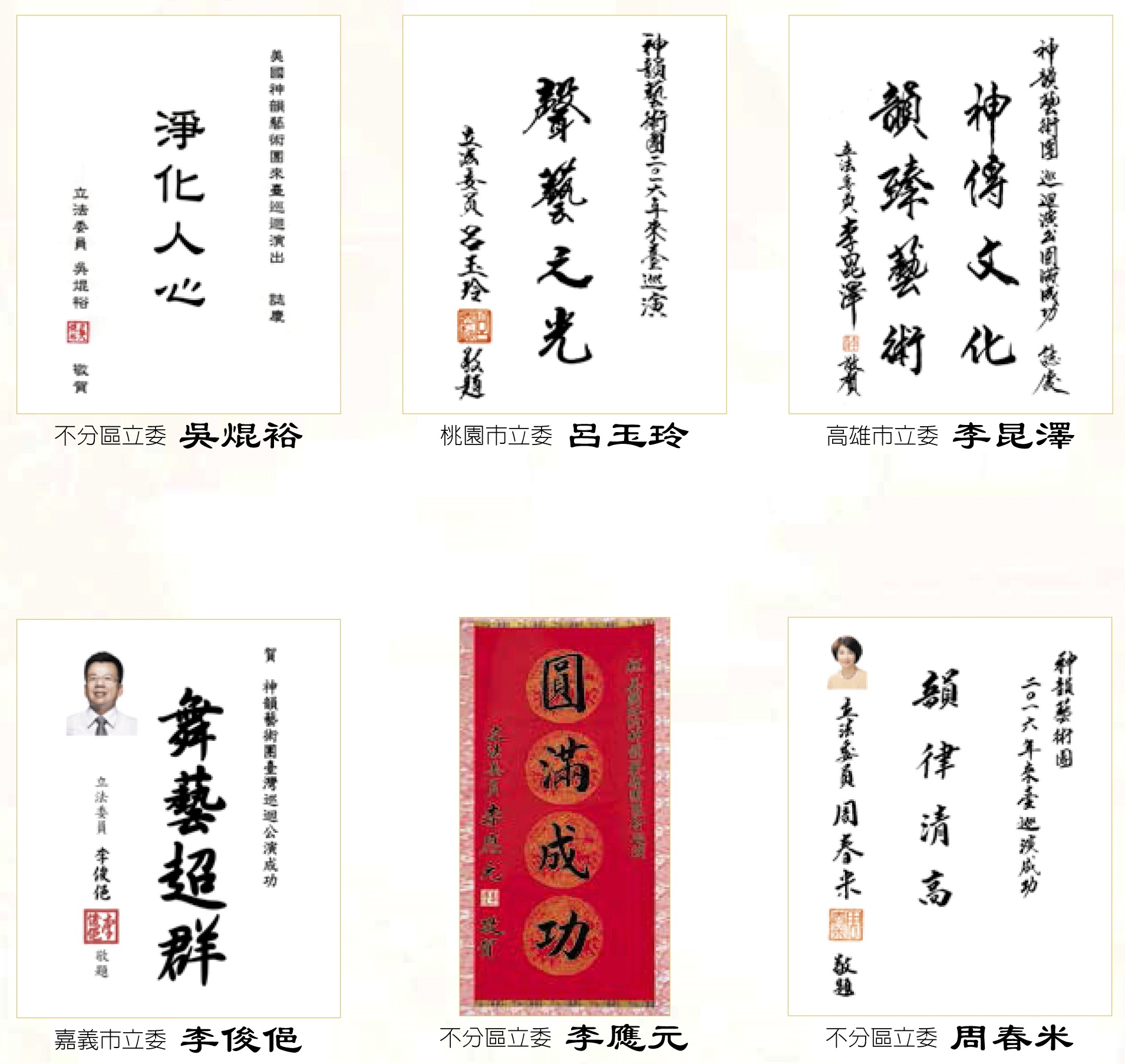 ![]() 圖3:台灣立法院副院長蔡其昌、考試院副院長高永光、內政部長陳威仁與外交部長林永樂賀詞讚揚神韻。 |
