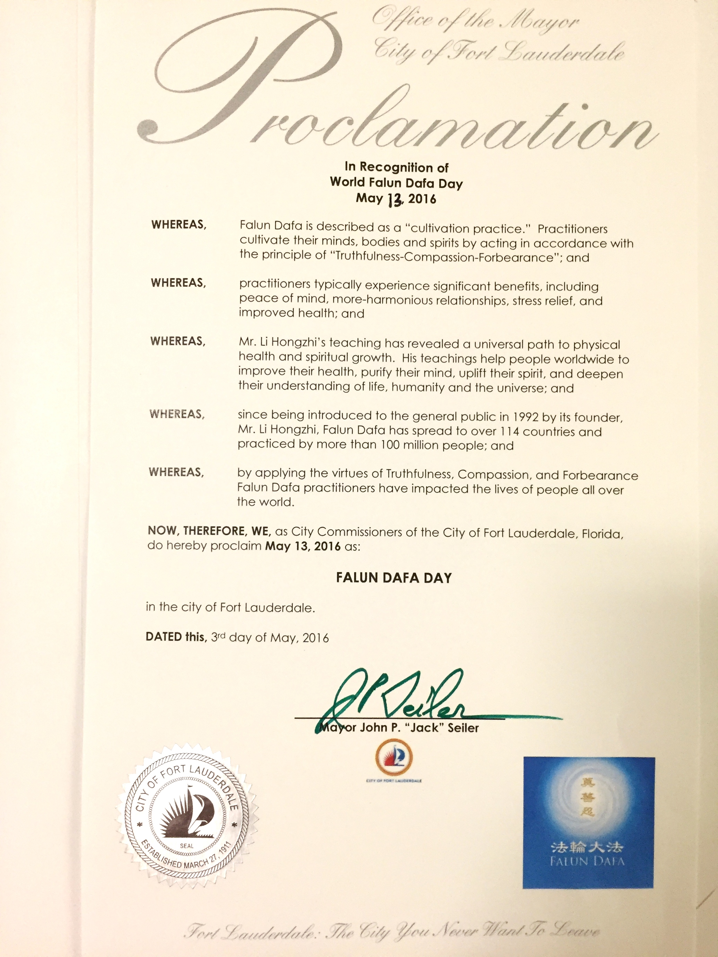 5月3日,佛羅里達州勞德代爾堡市(Fort Lauderdale)市長約翰.P.「傑克」塞勒 (John P. 「Jack」 Seiler)以市政委員會名義宣布2016年5月13日為勞德代爾堡市「法輪大法日」。