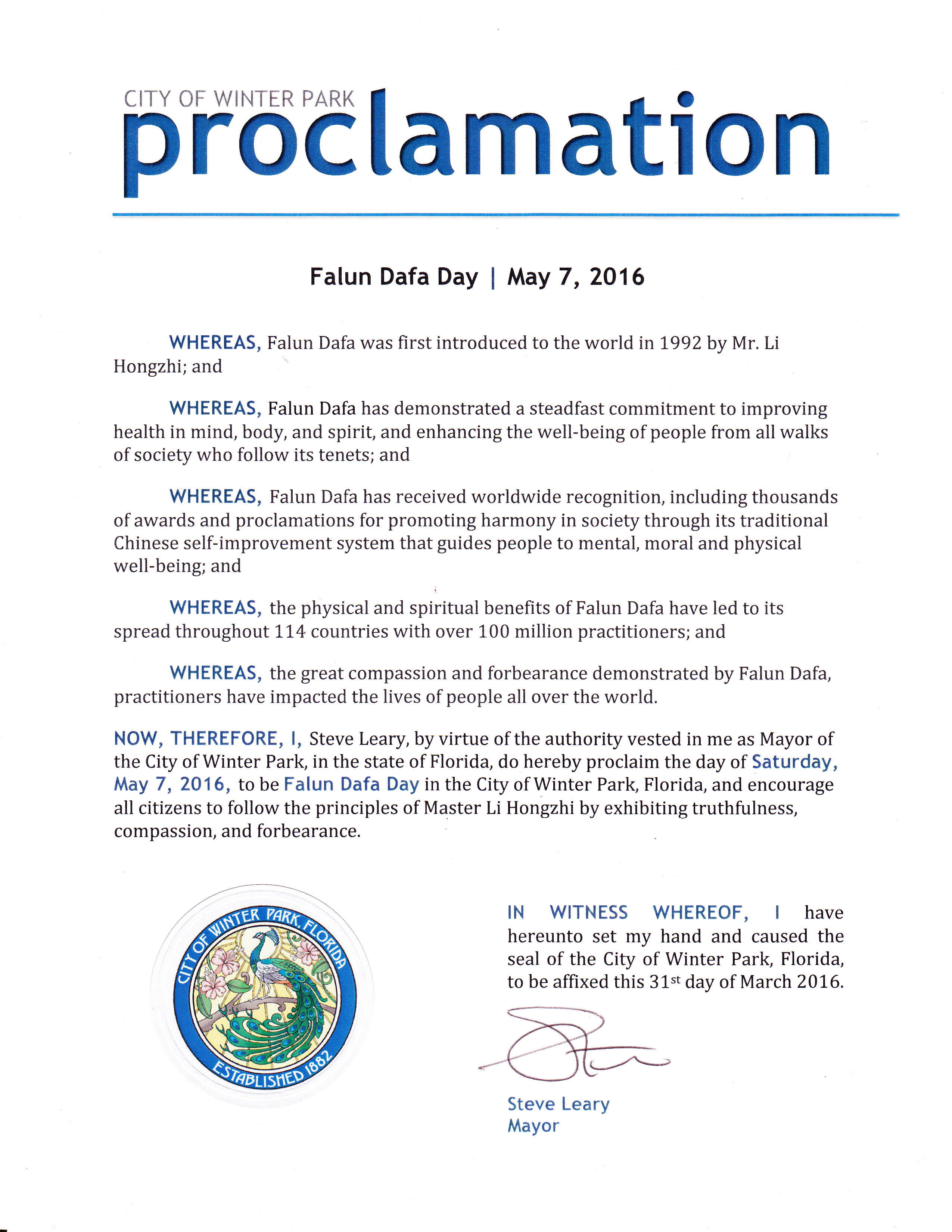 因此,現在,我,史蒂夫.利裏(Steve Leary),以佛羅里達州冬季公園市市長的名義,特此宣布2016年5月7日為冬季公園市的「法輪大法日」,並倡議所有市民都遵循李洪志先生所教導的「真、善、忍」原則。
