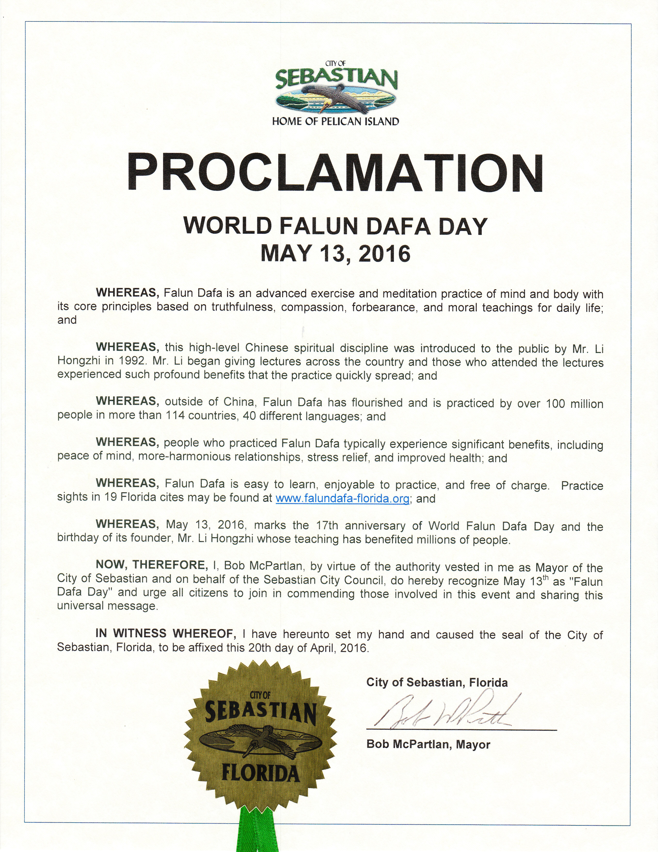 4月20日,佛羅里達州塞巴斯申市(Sebastian)市長Bob McPartlan代表塞巴斯申市議會宣布2016年5月13日為塞巴斯申市「法輪大法日」,並敦促所有市民表彰那些參與法輪大法日慶祝活動的人們。