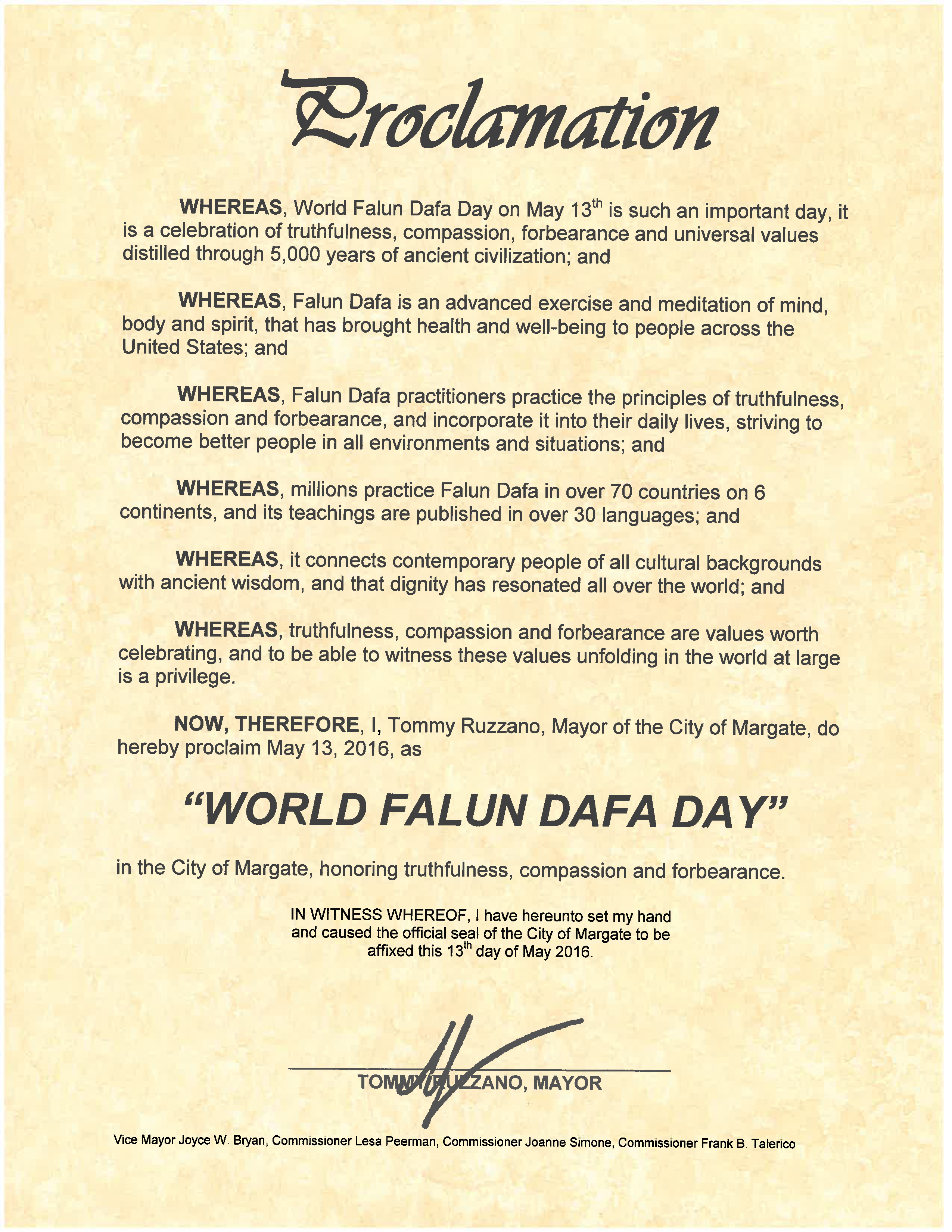 南佛州布勞沃德郡(Broward)馬蓋特市(City of Margate)市長Tommy Ruzzano也宣布五月十三日為馬蓋特市法輪大法日,並讚揚真、善、忍這一普世價值。