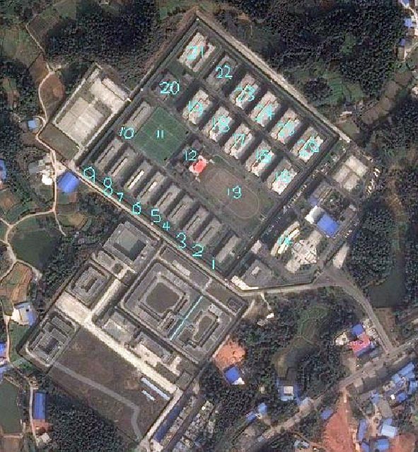 1、會見大樓; 2、二監區生產車間 ;3、八監區生產車間; 4、六監區生產車間;5、五監區生產車間; 6、七監區生產車間 ;7、三監區生產車間; 8、四監區生產車間;9、一監區生產車間 ;10、庫房 ;11、菜地 ;12、教育中心 ;13廣場 ;14、辦公樓;15、一監區; 16、二監區 ;17、三監區; 18、四監區; 19、五監區; 20、醫院;21、嚴管、集訓隊 ;22、配餐中心; 23、九監區; 24、八監區; 25、七監區;26、六監區。