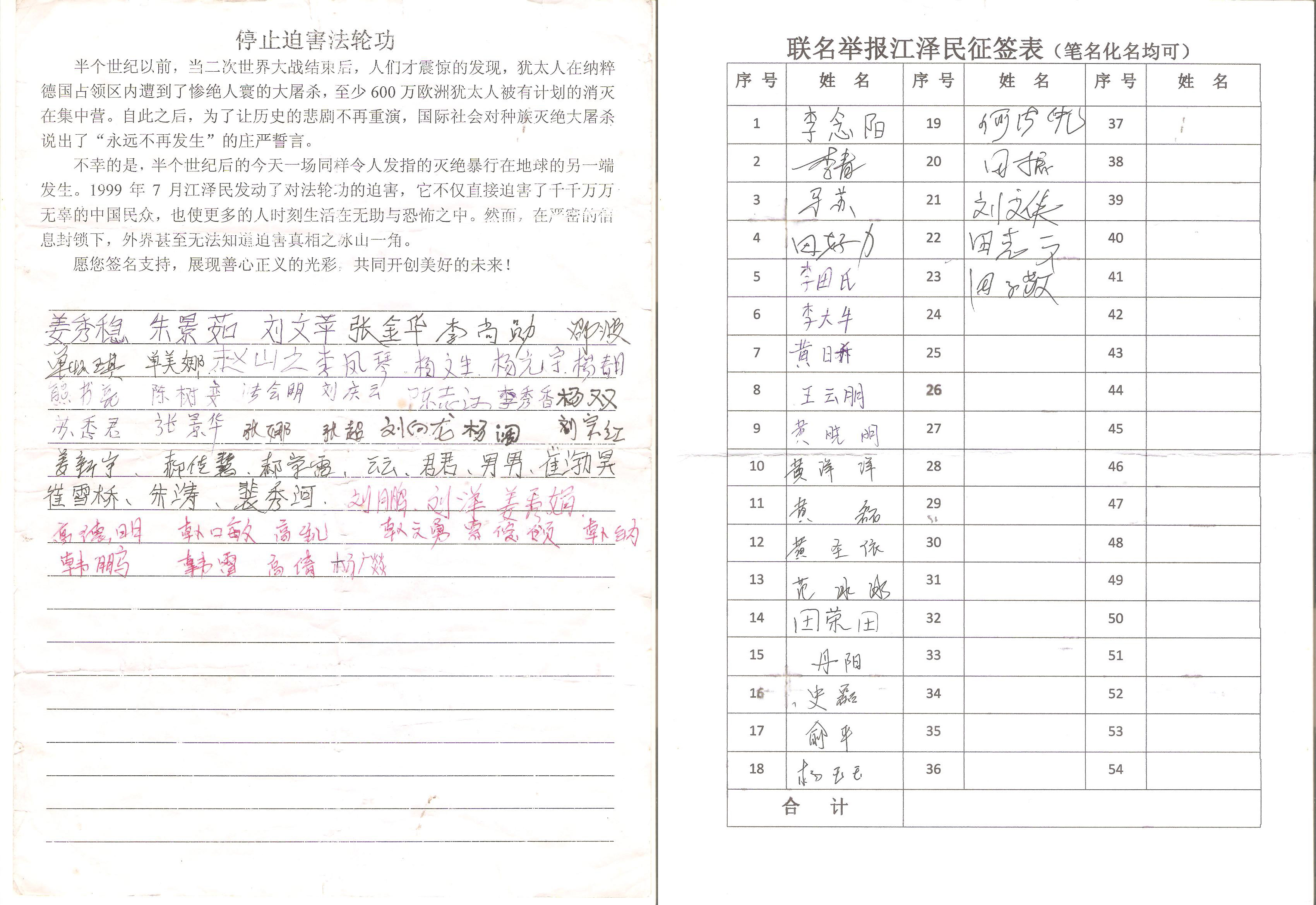 在蔬菜批發部,有當地菜農和遠一點的農民,他們聽說簽名舉報江澤民,勁頭可大了,其中一農民說:「早就盼望這一天,江澤民沒有給我們一點好,給我們帶來的都是苦難」。當時六個人簽了名。
