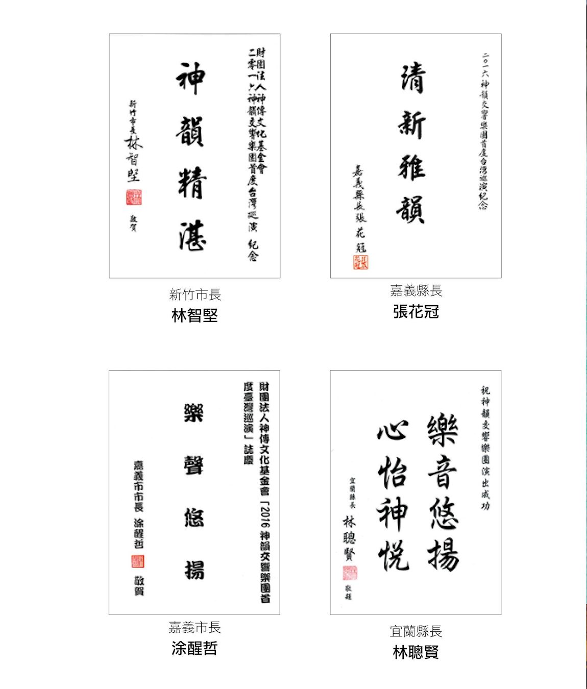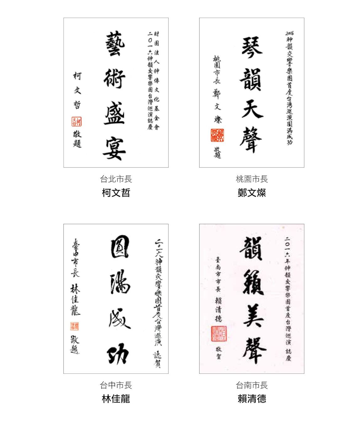 ![]() 圖4:台北市長柯文哲、桃園市長鄭文燦、台中市長林佳龍、台南市長賴清德發賀詞祝賀神韻交響樂團演出 |