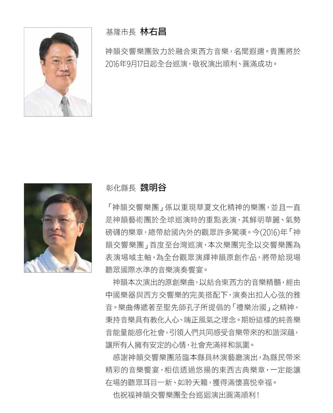 ![]() 圖6:基隆市長林右昌、彰化縣長魏明谷發賀文祝賀神韻交響樂團演出 |