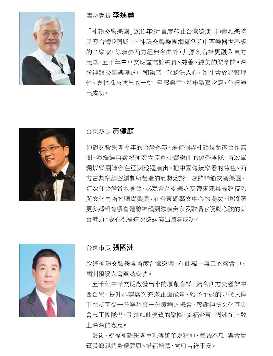 宜蘭縣議會議長陳文昌在賀文中推崇中西融合的神韻交響樂團,將華夏文化中的民間傳說、歷史故事與民族音樂,結合西方經典曲目,作具體的展現,孕育出天籟之音。
