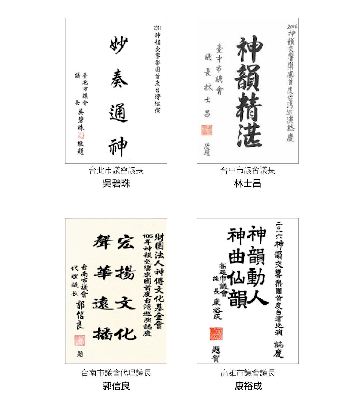 此外,台北市議會議長吳碧珠、台中市議會議長林士昌、台南市議會代理議長郭信良與高雄市議會議長康裕成,分別發出「妙奏通神」、「神韻精湛」、「宏揚文化、聲華遠播」與「神韻動人、神曲仙韻」讚揚神韻交響樂團。