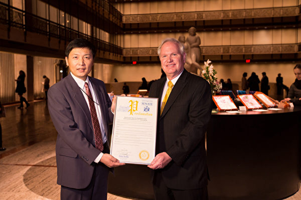 ![]() 圖10:在紐約神韻晚會首演當晚,一月十一日晚,紐約州參議員、2017紐約市長參選人艾維樂(Tony Avella)在趕到林肯中心大衛寇克劇院向紐約神韻主辦方頒發褒獎。他說:「我很高興能代表紐約州議會來此致賀。」 |