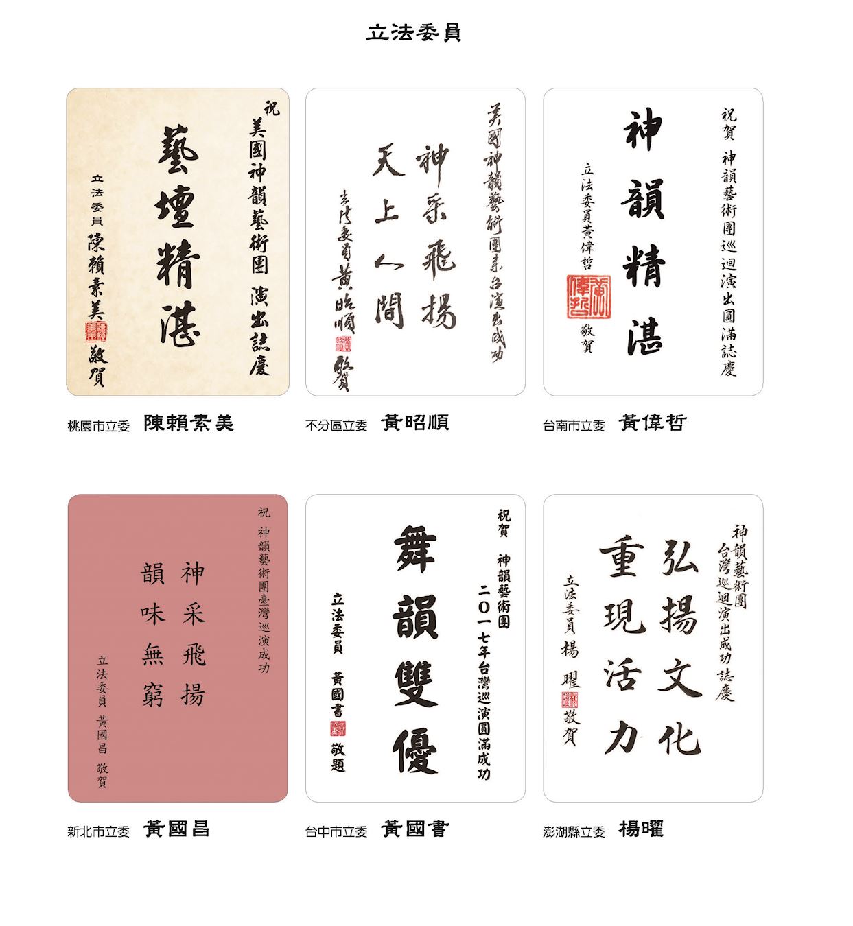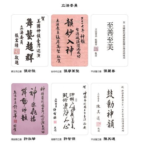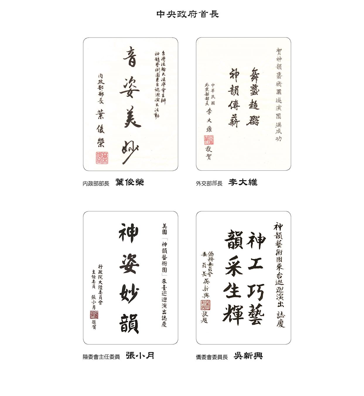 行政院大陸委員會主委張小月、內政部長葉俊榮、外交部長李大維、行政院僑務委員會委員長吳新興等中央部會首長都相繼以「神姿妙韻」、「音姿美妙」、「舞藝超群 神韻傳薪」、「神工巧藝 韻採生輝」讚賀神韻。