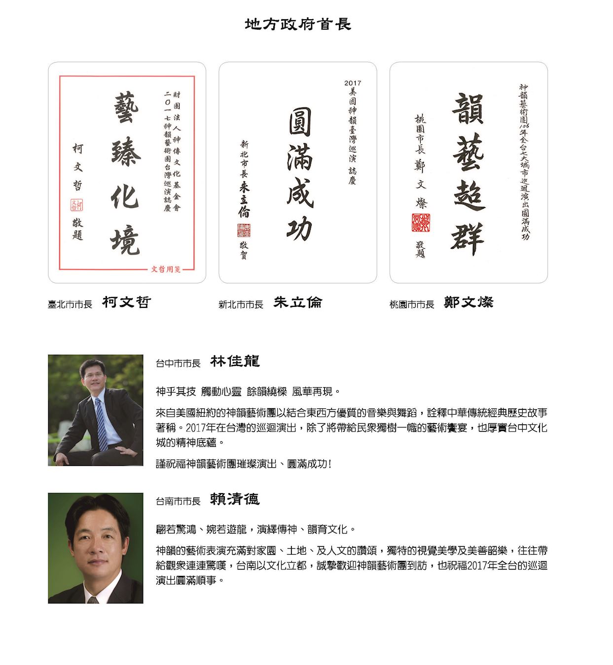 台北市長柯文哲表示:「藝臻化境」。台中市長林佳龍賀詞表示,「神乎其技,觸動心靈,餘音繞樑,風華再現。來自美國紐約的神韻藝術團以結合東西方優質的音樂與舞蹈,詮釋中華傳統經典歷史故事著稱。2017年在台灣的巡迴演出,除了將帶給民眾獨樹一幟的藝術饗宴,也厚實台中文化城的底蘊。」