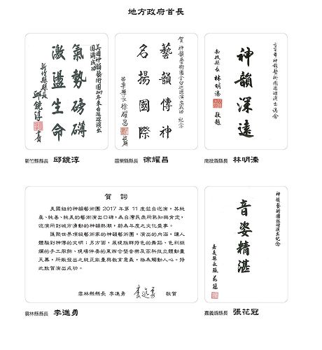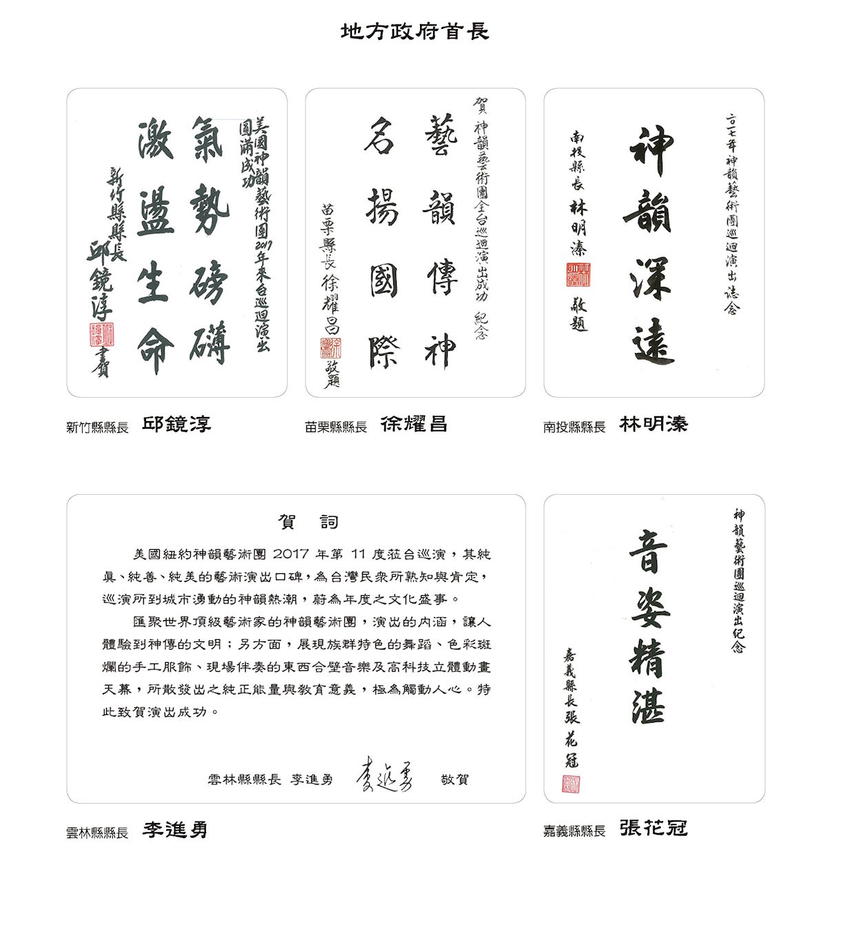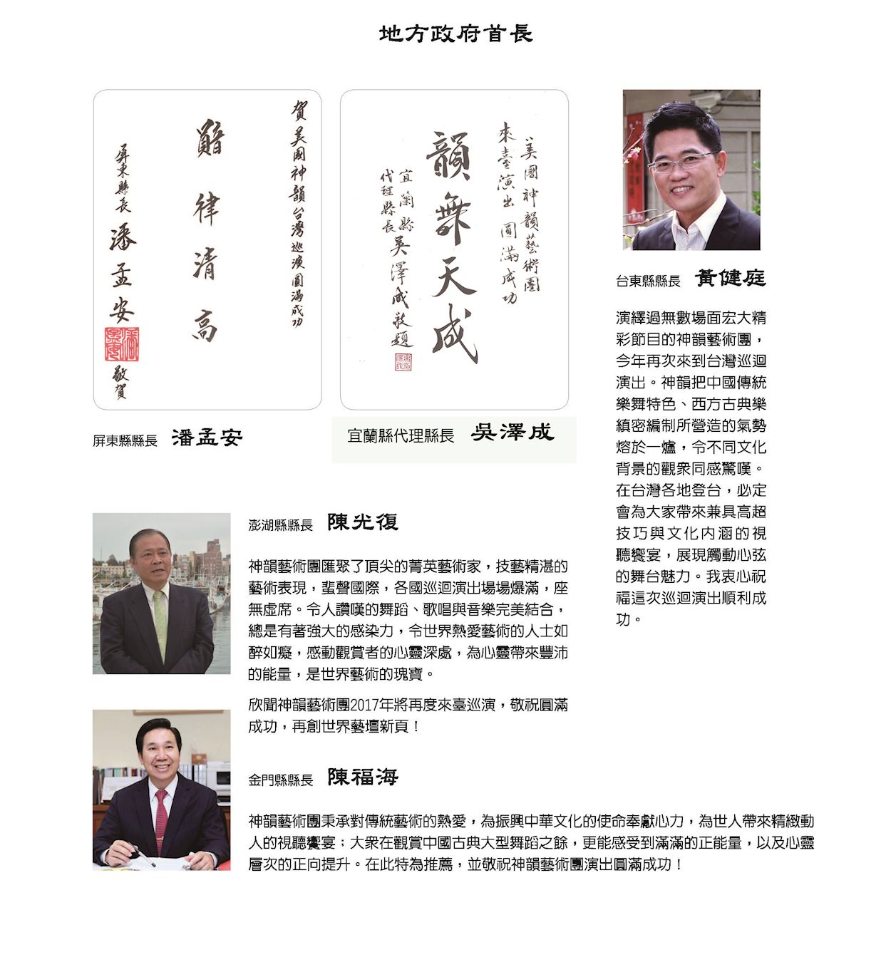 台灣其他縣市共十三位地方政府首長,包括基隆市長林右昌、新竹縣長邱鏡淳、新竹市長林智堅、苗栗縣長徐耀昌、南投縣長林明溱、雲林縣長李進勇、嘉義縣長張花冠、嘉義市長塗醒哲、屏東縣長潘孟安、宜蘭縣代理縣長吳澤成、台東縣長黃健庭、澎湖縣長陳光復,以及金門縣長陳福海和六十二位立法委員(國會議員),紛紛以「神舞飛韻」、「藝臻化境」、「神舞天韻」、「舞藝超群」、「至善至美」、「神韻精湛」、「神乎其技 精妙絕倫」等賀詞歡迎神韻蒞臨。