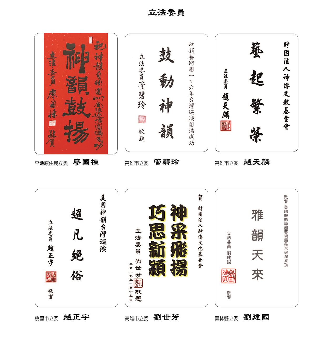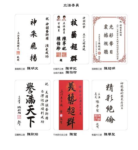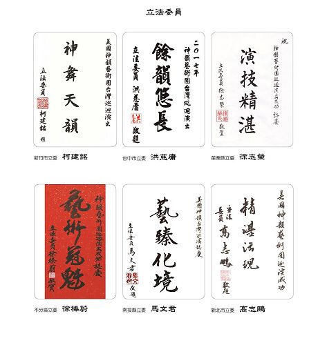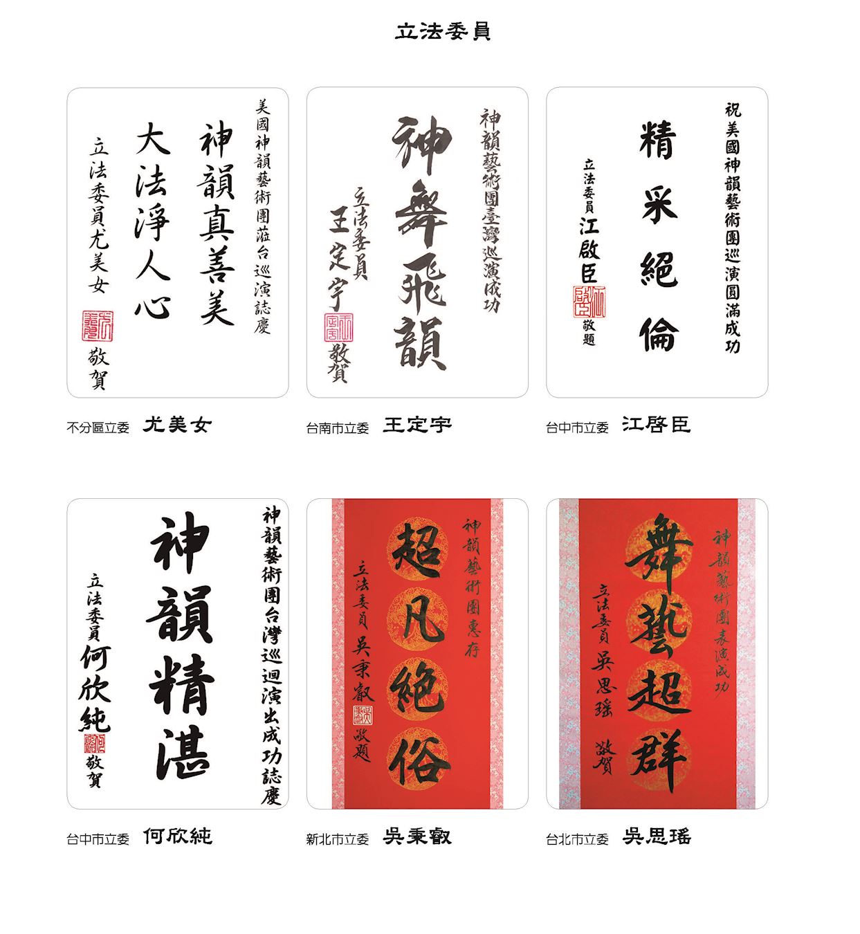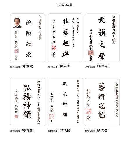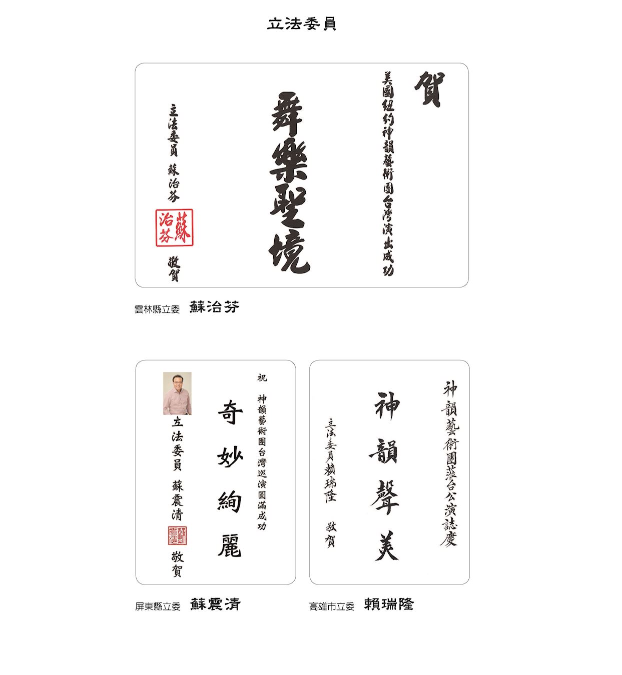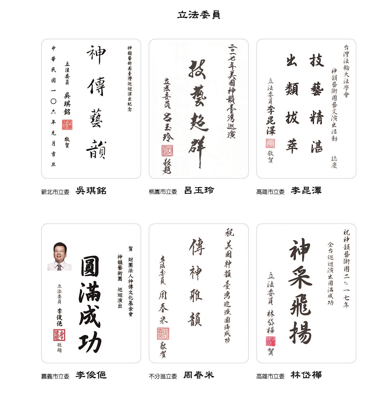 圖2:台灣行政院長林全、立法院長蘇嘉全、考試院長伍錦霖、立法院副院長蔡其昌賀詞讚揚神韻。 |