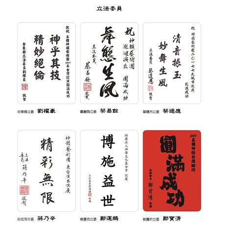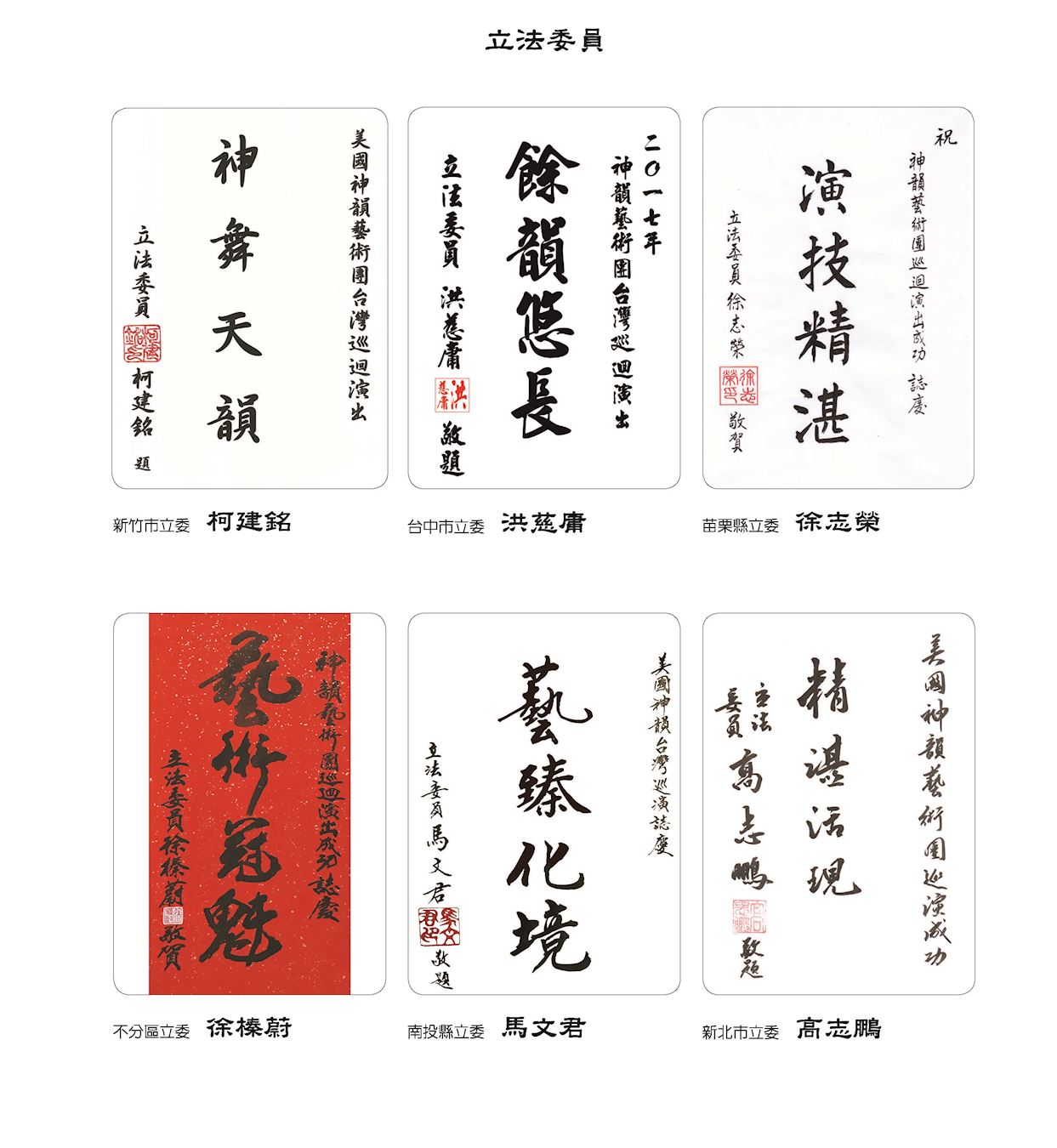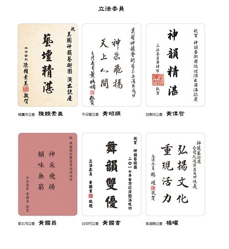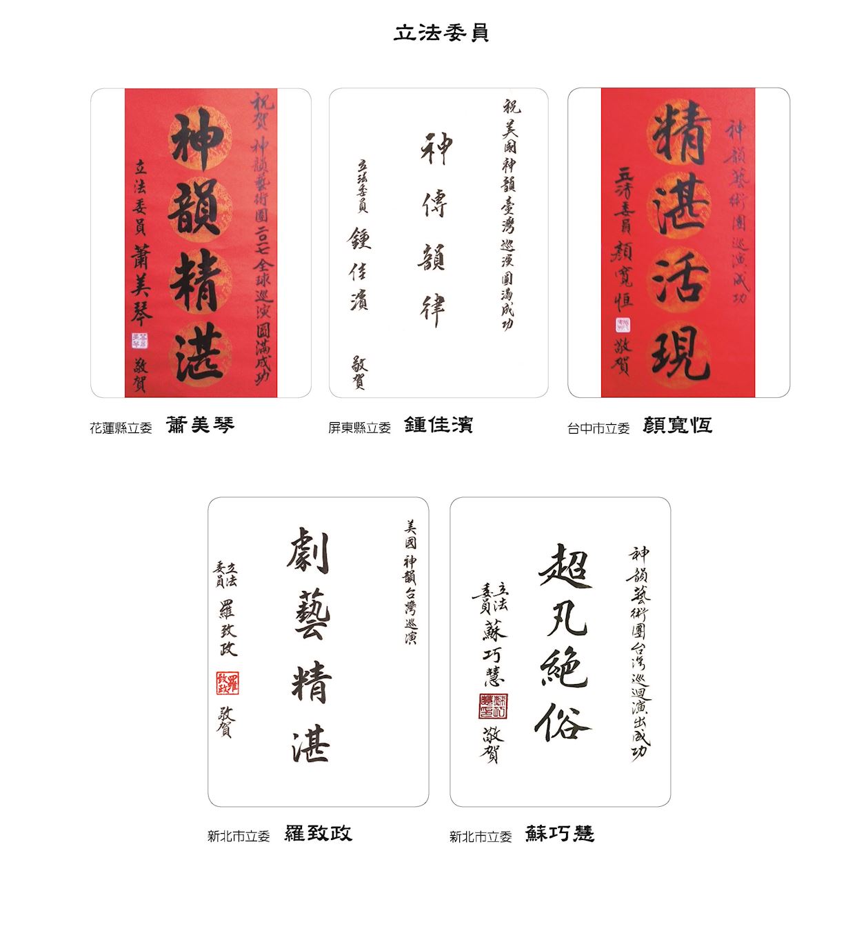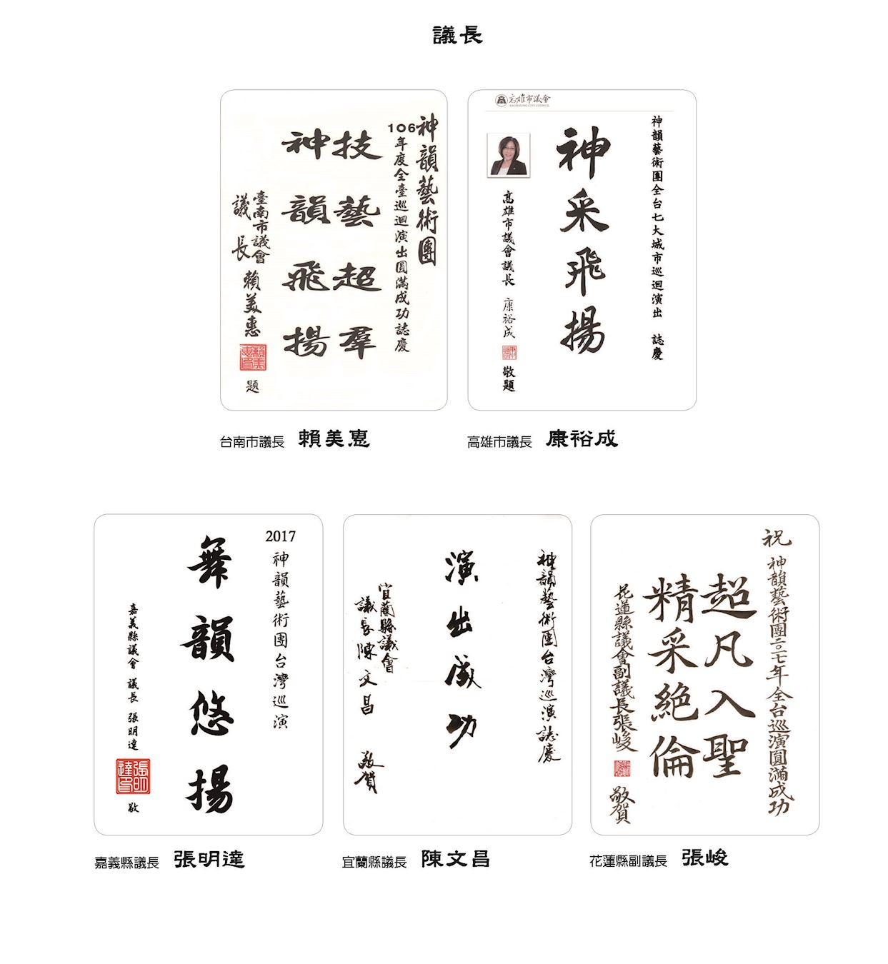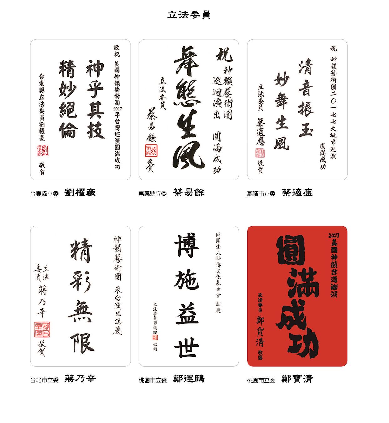 圖2:台灣行政院長林全、立法院長蘇嘉全、考試院長伍錦霖、立法院副院長蔡其昌賀詞讚揚神韻。 |