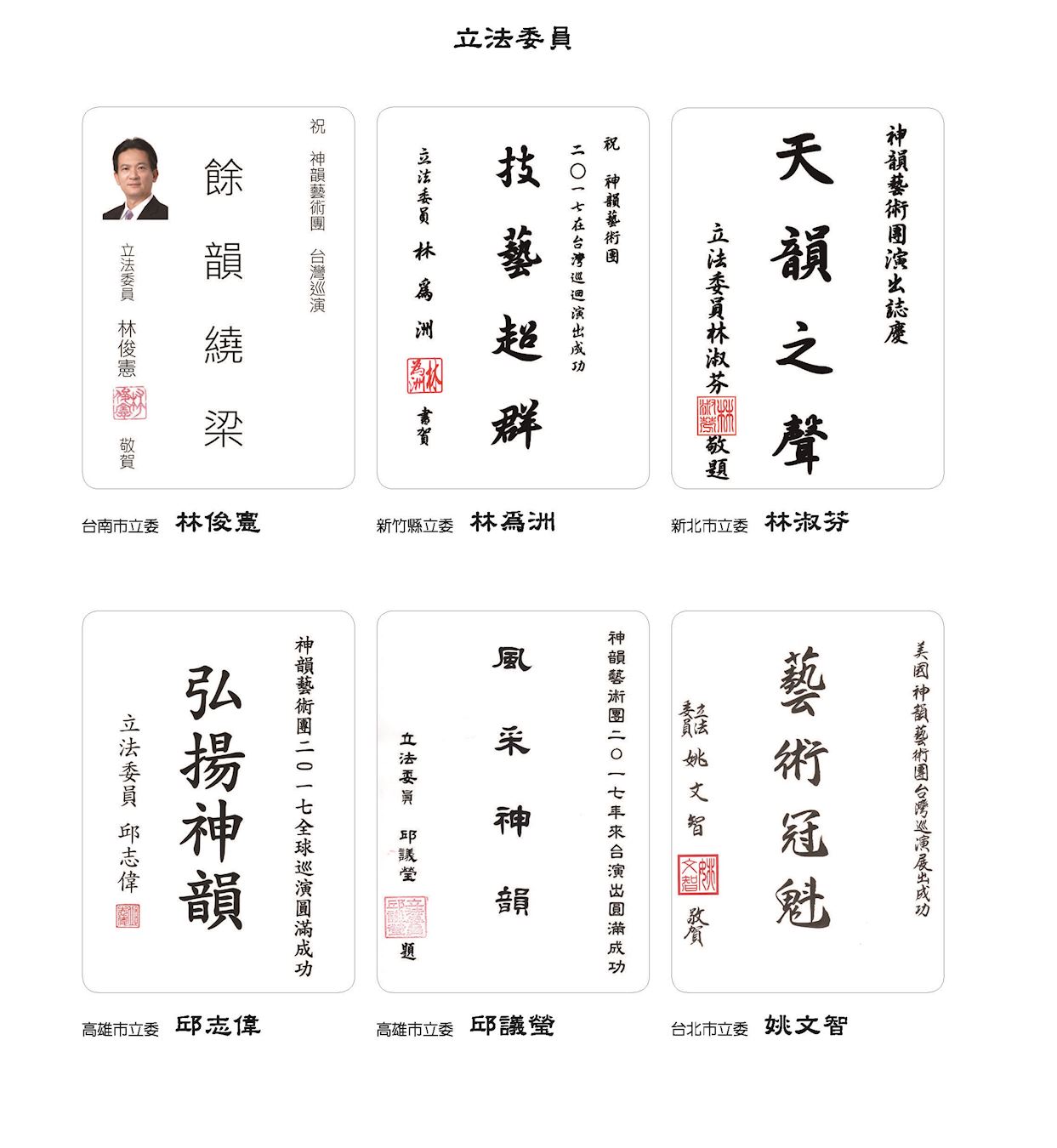 「天上人間 舞動人心」行政院長林全推崇神韻演出的精彩華美;立法院長蘇嘉全以「賞心悅目」一詞讚賀神韻;連年發出賀詞的考試院長伍錦霖,則以「藝絕古今」一語迎賀神韻;立法院副院長蔡其昌以「神思妙韻 藝臻化境」稱頌神韻。