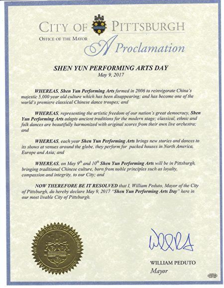 ![]() 圖14:匹茲堡市市長鄭重宣布二零一七年五月九日為匹茲堡市的「神韻藝術團日」。 |