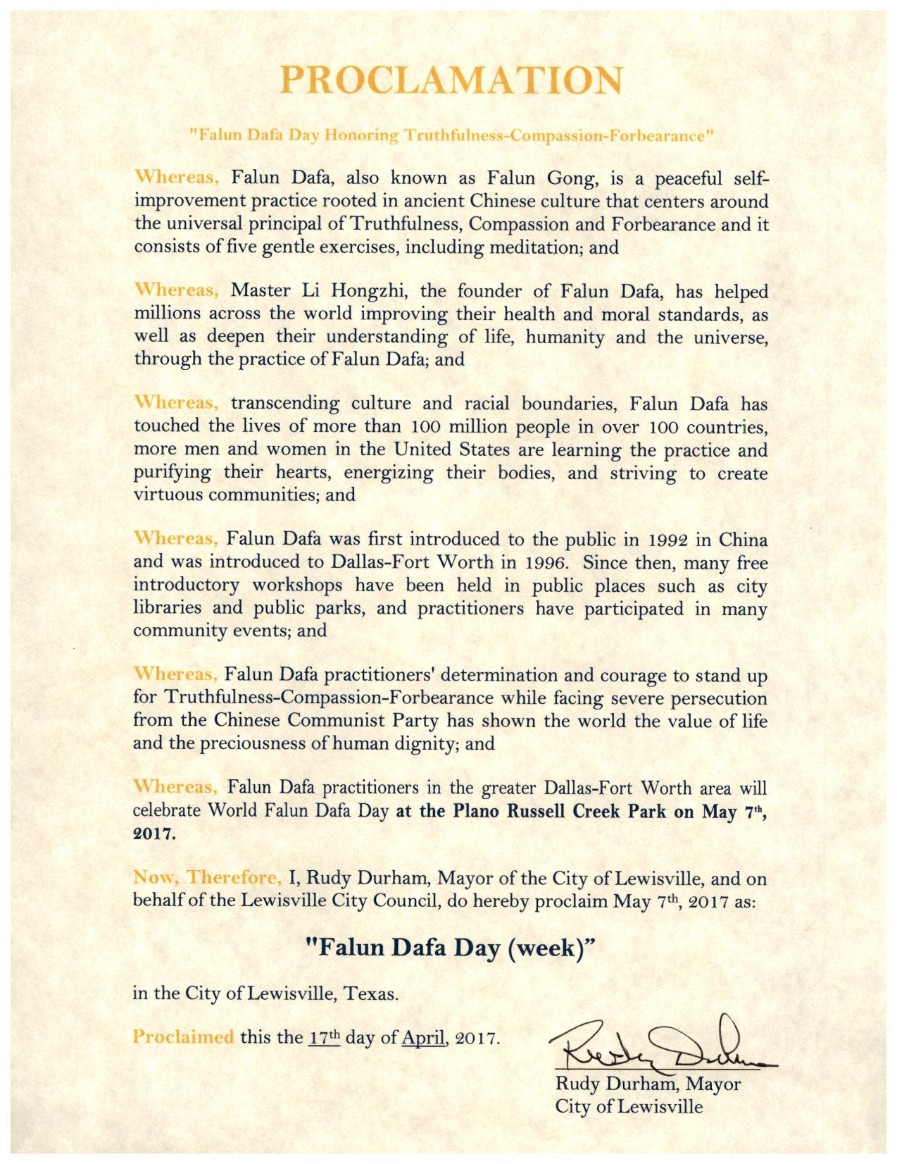 【明慧網二零一七年五月十二日】(明慧記者曾洪美國達拉斯報導)美國德克薩斯州達拉斯地區法輪功學員於二零一七年五月七日在布蘭諾(City of Plano)Russell Creek公園慶祝法輪大法洪傳世界二十五週年暨第十八世界法輪大法日,達拉斯-沃斯堡地區十個城市的市長給美南法輪大法學會發來褒獎令,宣布「法輪大法日」,盛讚法輪大法的真、善、忍理念及對社區的貢獻。