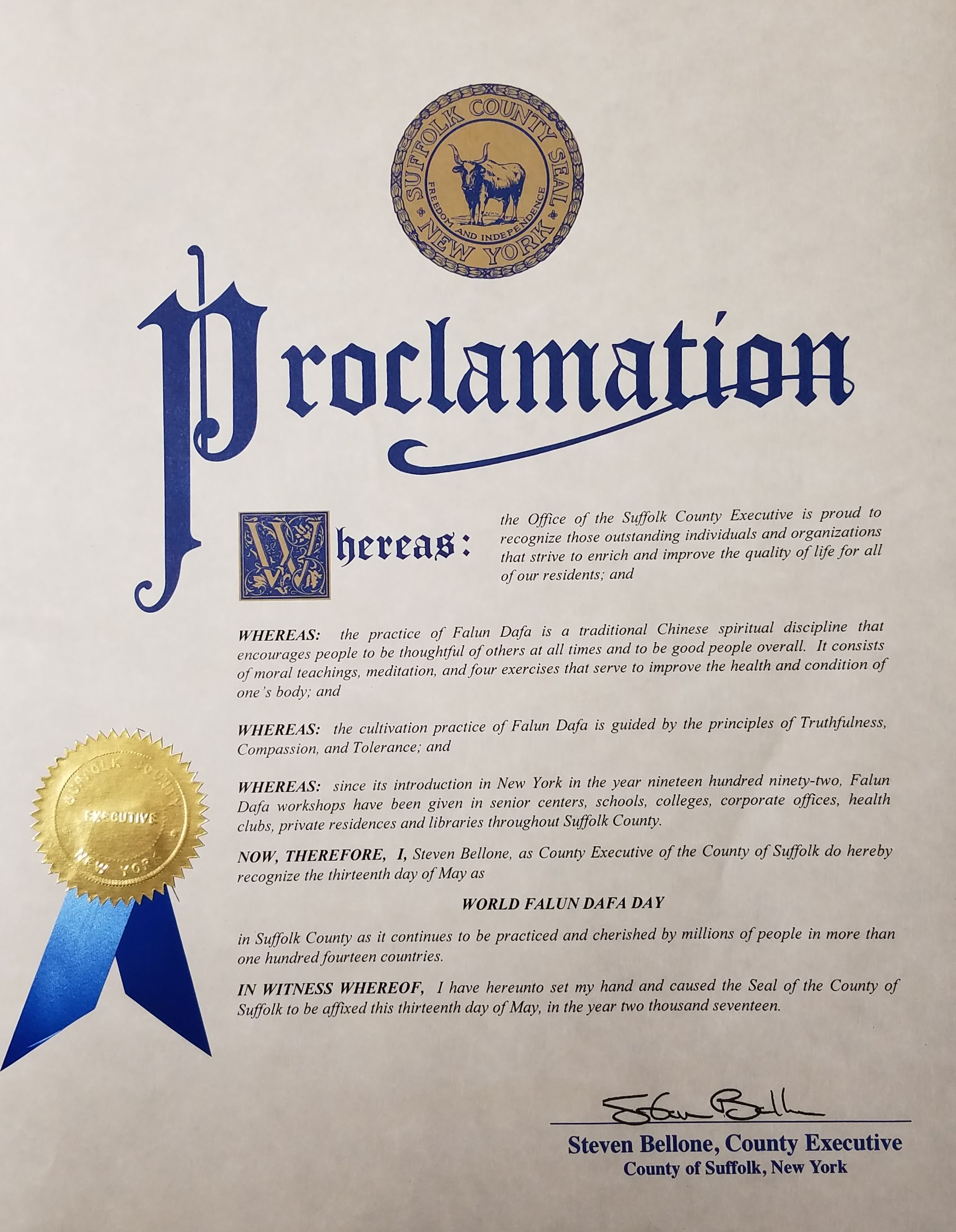 紐約長島薩福克縣(Suffolk County) 執行長史蒂芬•拜隆(Steven Bellone)頒發褒獎,讚揚法輪大法的「真、善、忍」理念,並宣布二零一七年五月十三日為薩福克縣的世界法輪大法日。