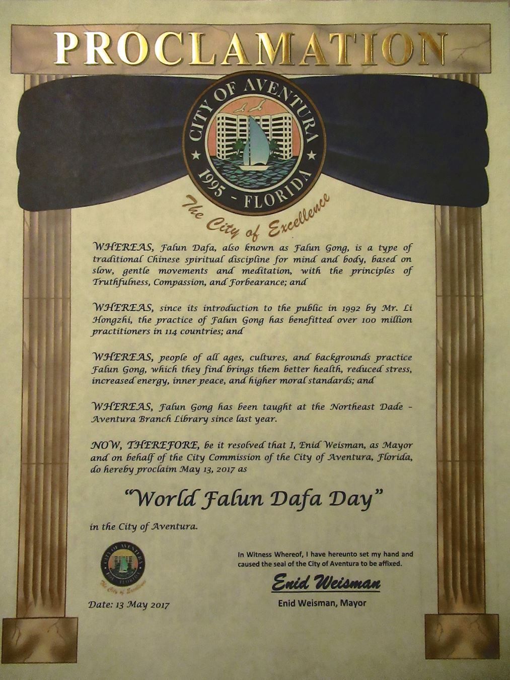 ![]() 圖:佛州阿文圖拉市(Aventura)市長伊尼德﹒韋斯曼(Enid Weisman)頒發褒獎狀,頌揚法輪大法為人們帶來身心健康和更高的道德標準,並宣布二零一七年五月十三日為阿文圖拉市「世界法輪大法日」 |