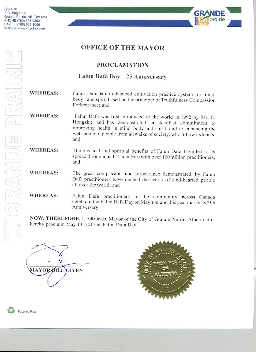 大草原市(Grande Prairie)市長宣布五月十三日為「法輪大法日」。以下是市長比爾﹒吉溫(Bill Given)發出的褒獎譯文: